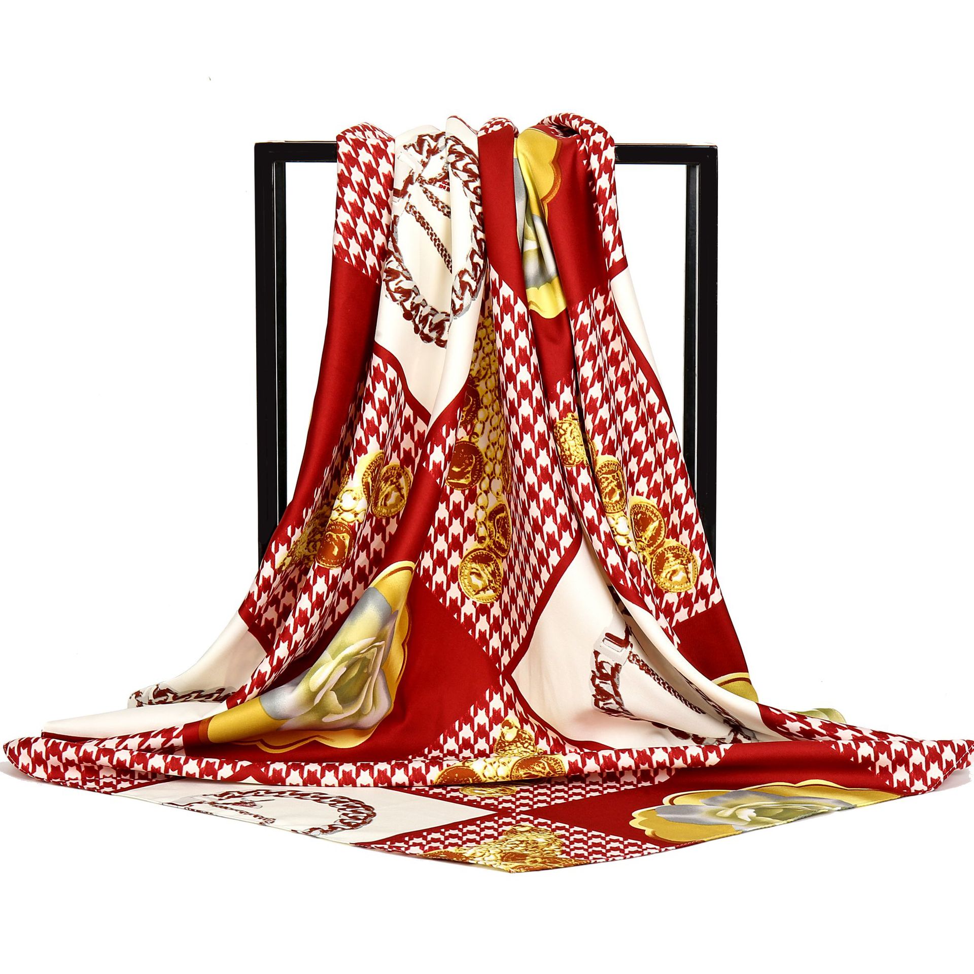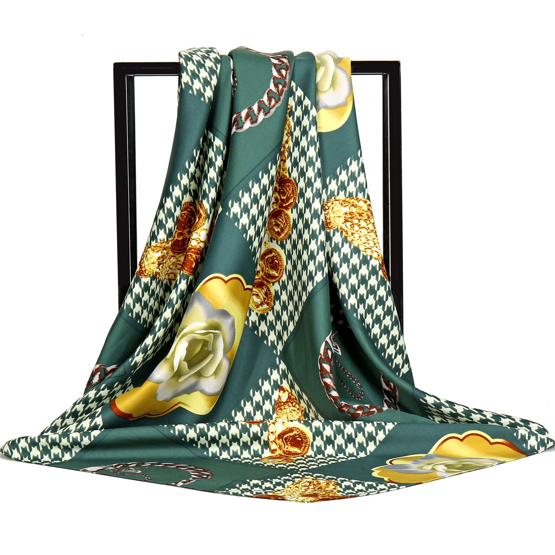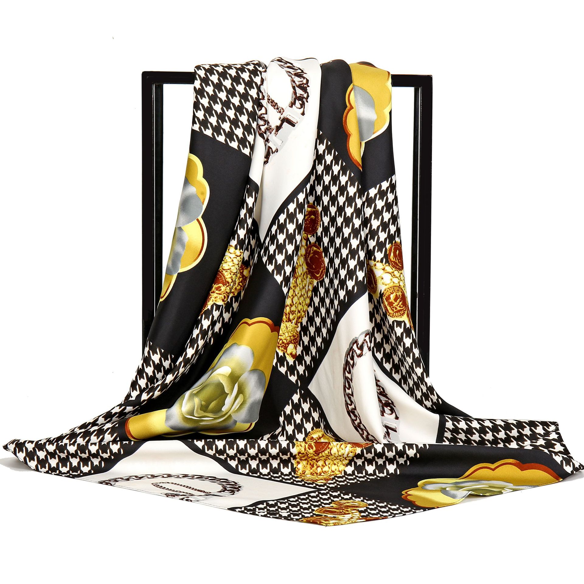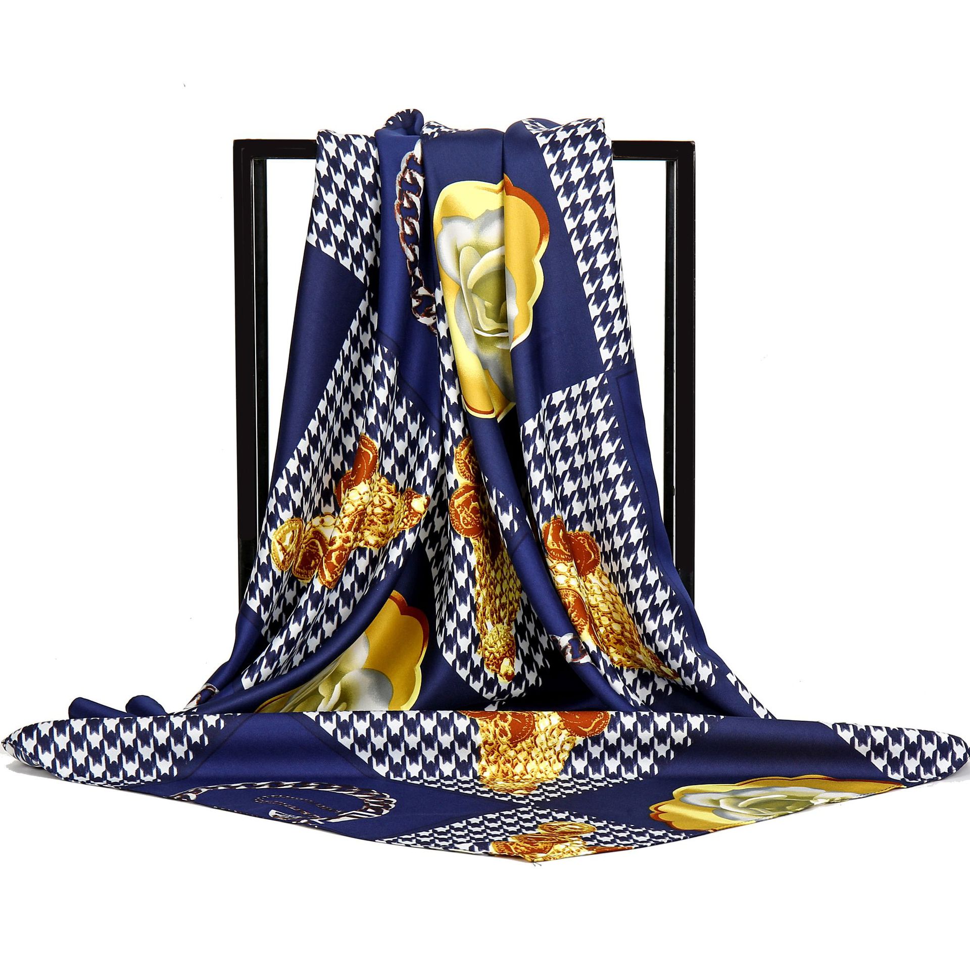 Gao 그는 세련된 우아한 샤넬 스타일 브로치 꽃 무늬 트윌 프린트 스카프 여성용 대형 스퀘어 스카프 헤드 스카프