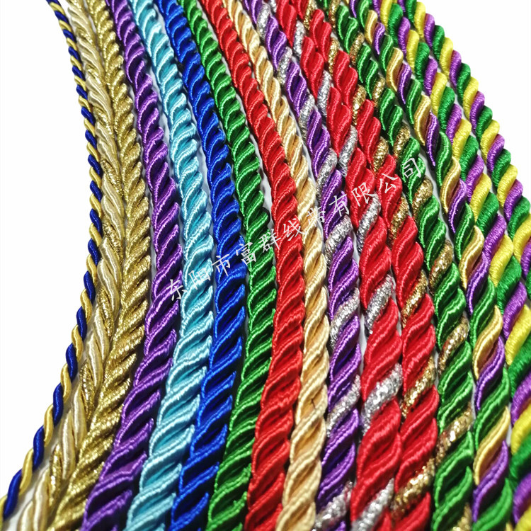 本厂专业生产定制各种绳子,此款产品是三股绳。可以定制5mm-8mm的直径,加金,加银,混色搭配,单色粗细调整等等!包装100米/支或者50米一支,亦可以定制卷筒,详询客服!
