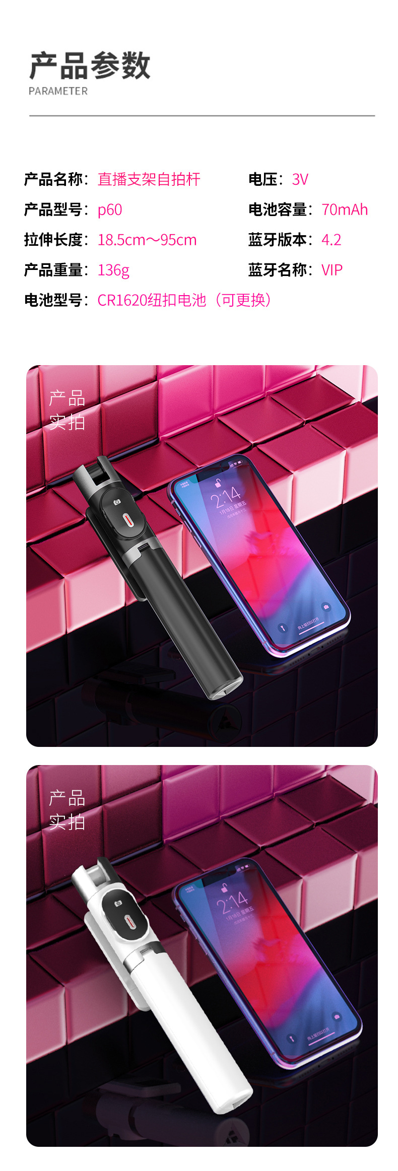 • P60-V2 블루투스 셀카 스틱/블랙/더블 라이트