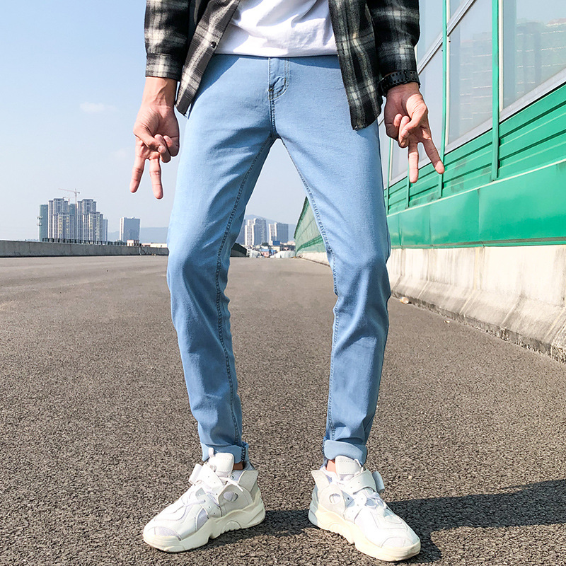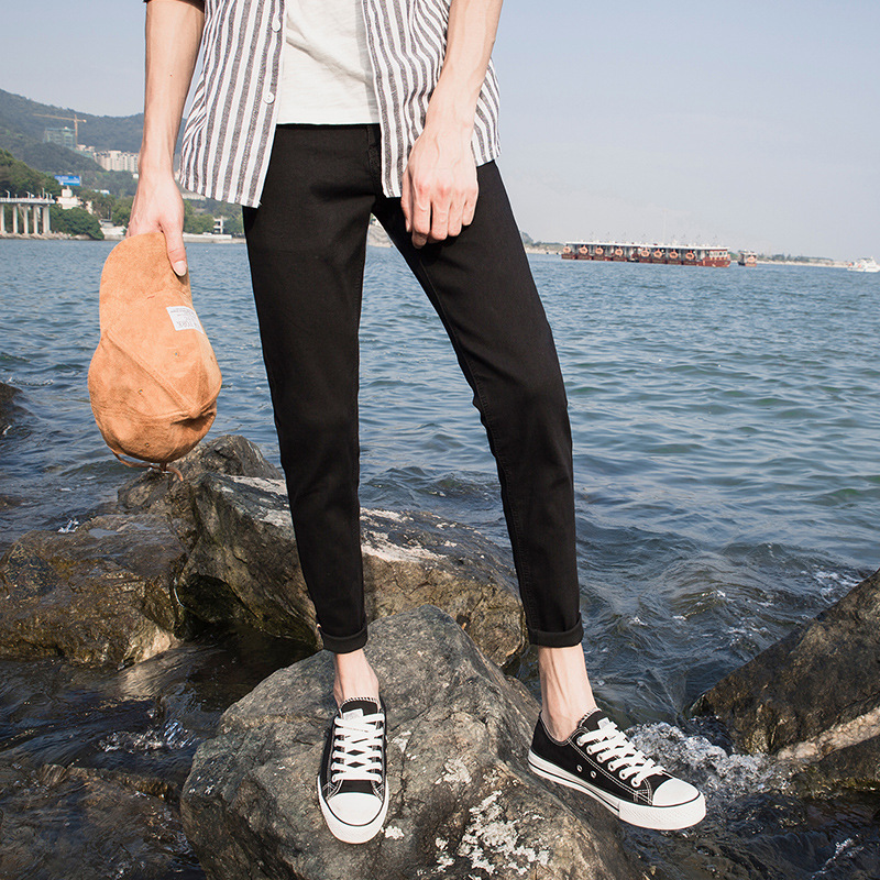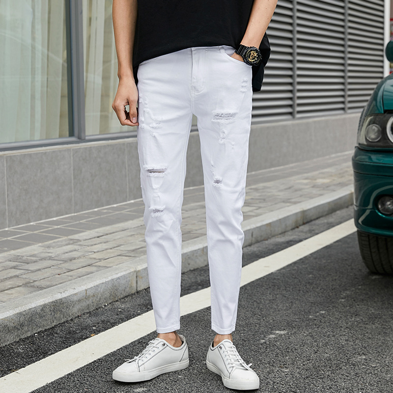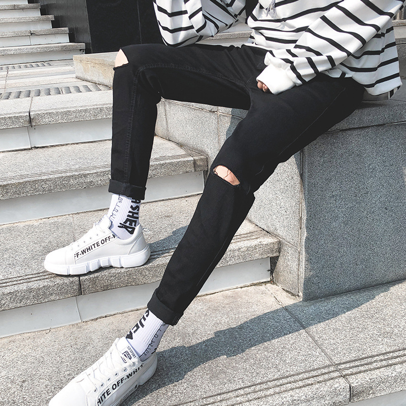 여름 얇은 블랙 진 무릎 찢어진 바지 남성용 트렌디한 한국식 슬림핏 거지 팬츠