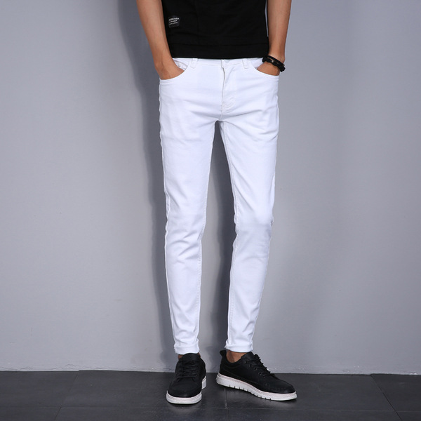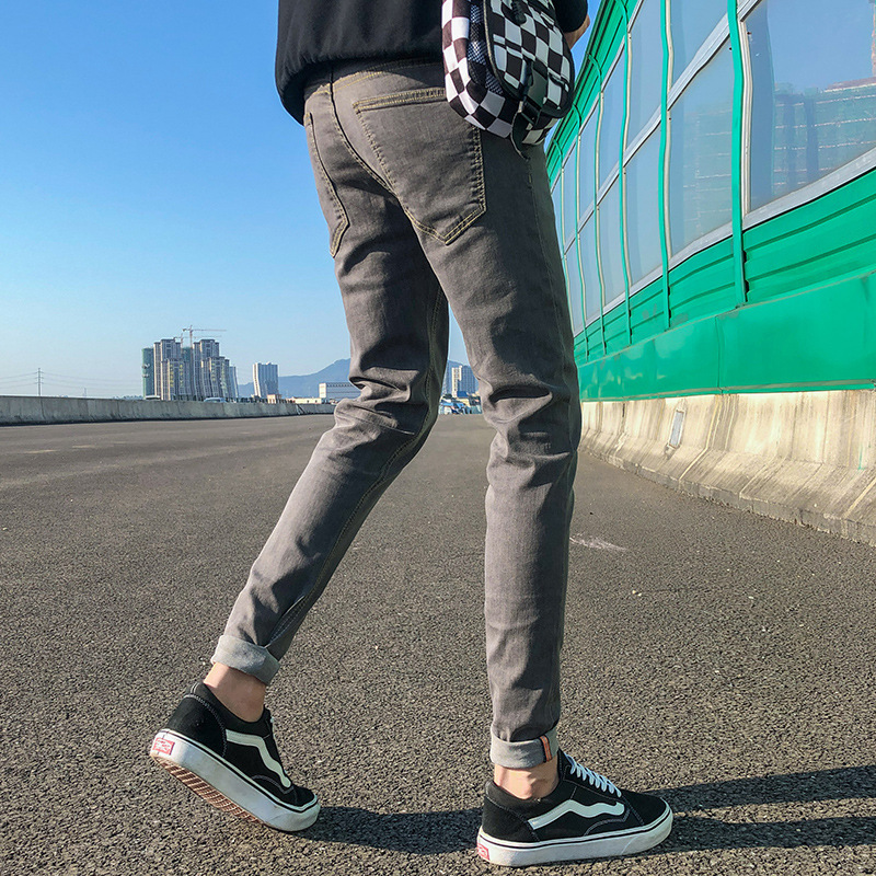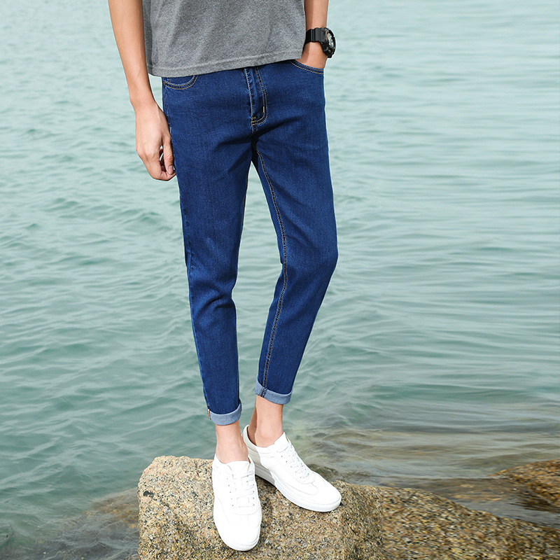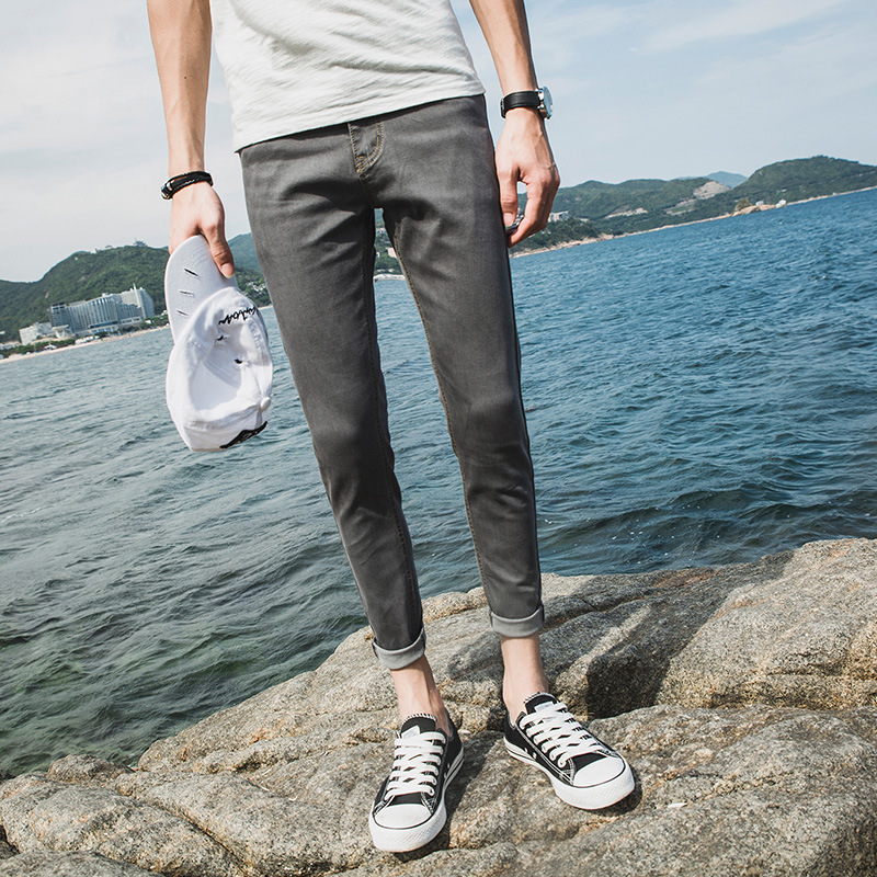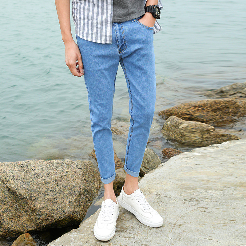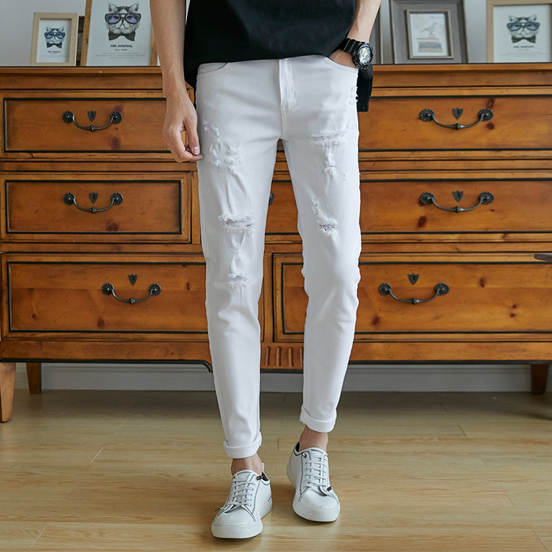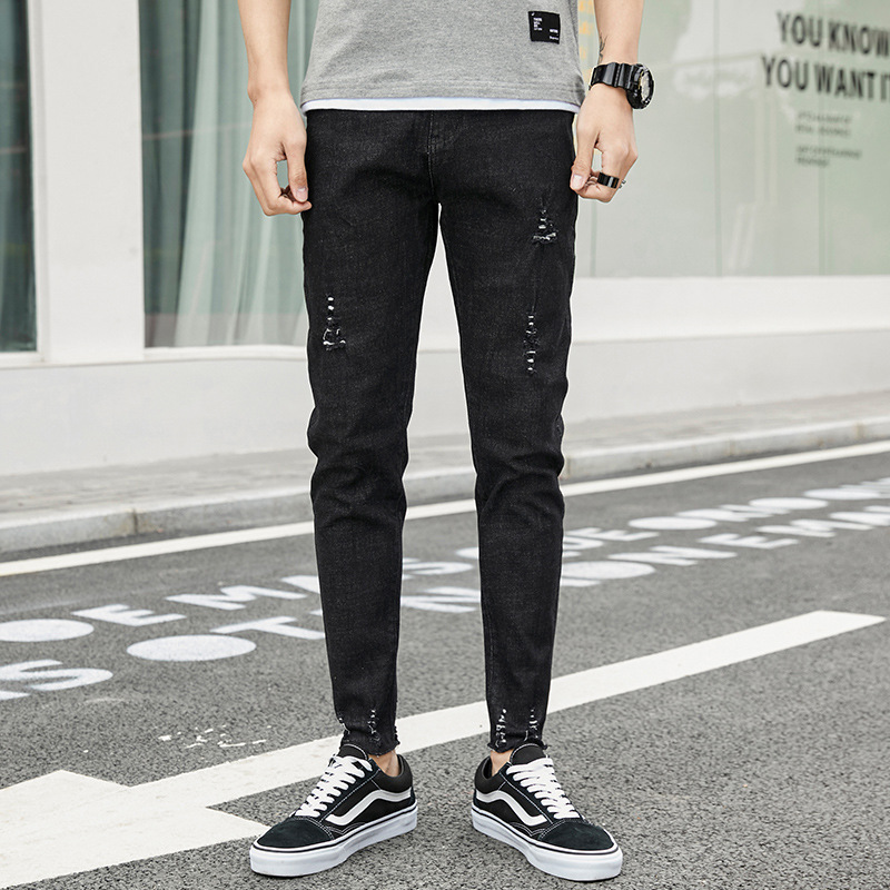 여름 얇은 블랙 진 무릎 찢어진 바지 남성용 트렌디한 한국식 슬림핏 거지 팬츠스토어 가기