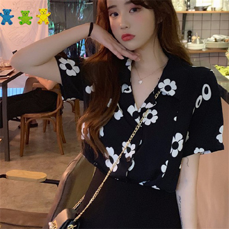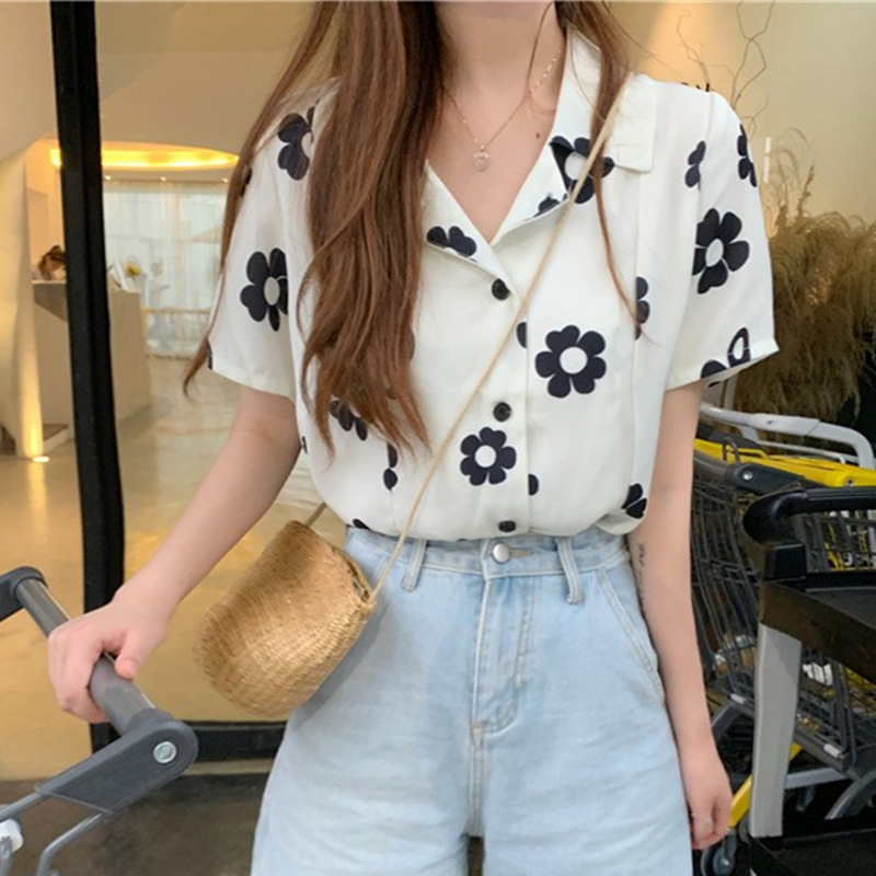 2023 여름 새로운 한국 스타일 복고풍 주름진 국화 인쇄 느슨한 슬리밍 모든 매치 웨스턴 스타일 하트 머신 여성용 반소매 셔츠스토어 가기