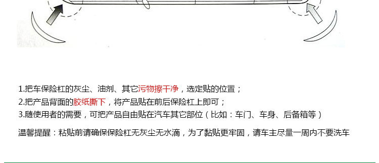 1、将本品贴于汽车的前唇或能有效地防止由于意外而引起汽车的损伤。