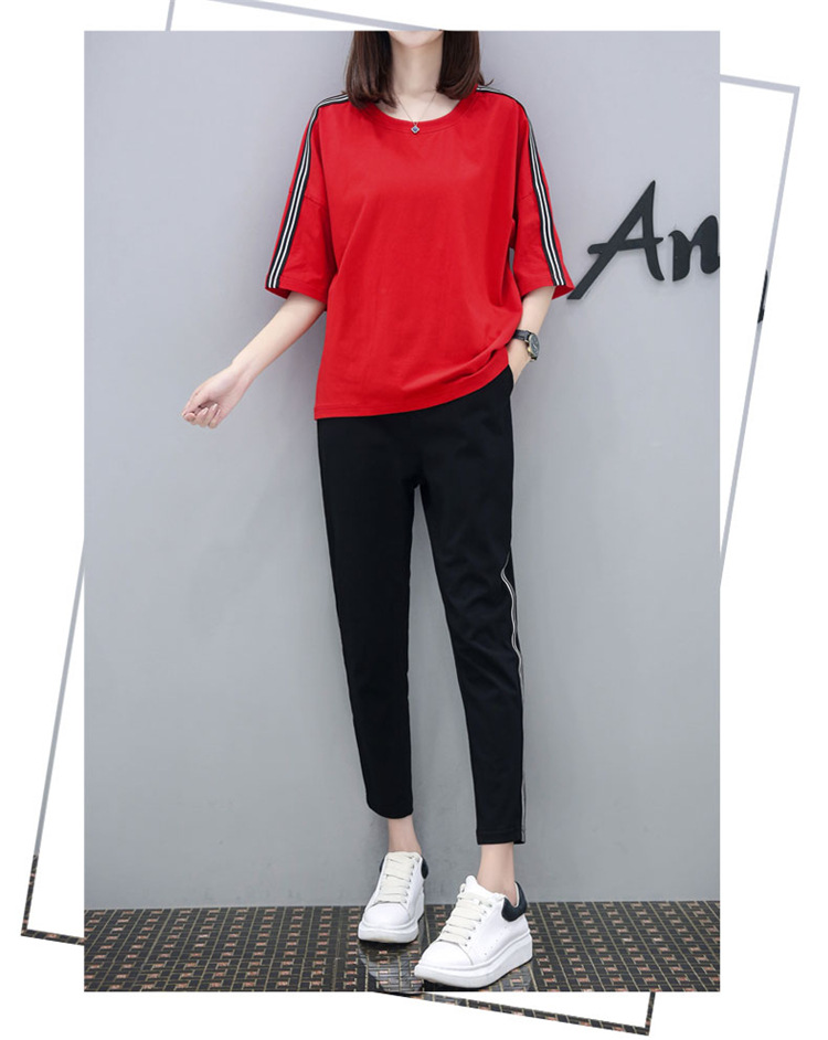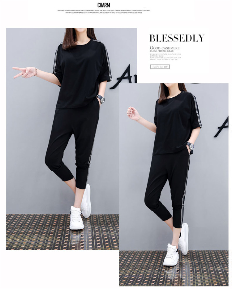 스포츠 세트 여름 패션 한국 스타일 루즈한 캐주얼 티셔츠 슬리밍 할란 팬츠 투피스 세트 여성 학생 올매치 트렌디