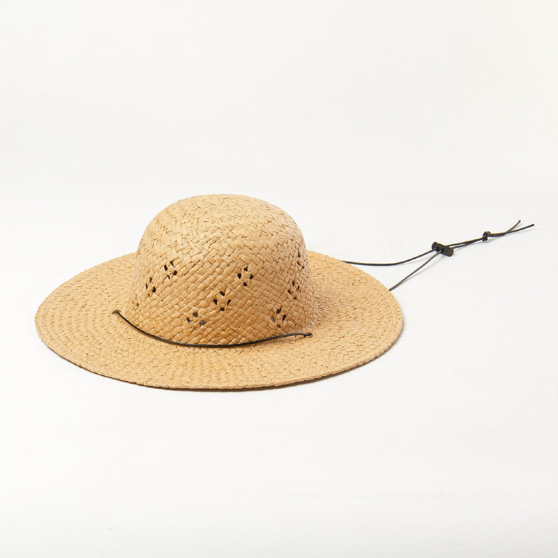 品名:儿童春夏新款纸草镂空编织带绑带圆顶大檐草帽户外沙滩遮阳草帽