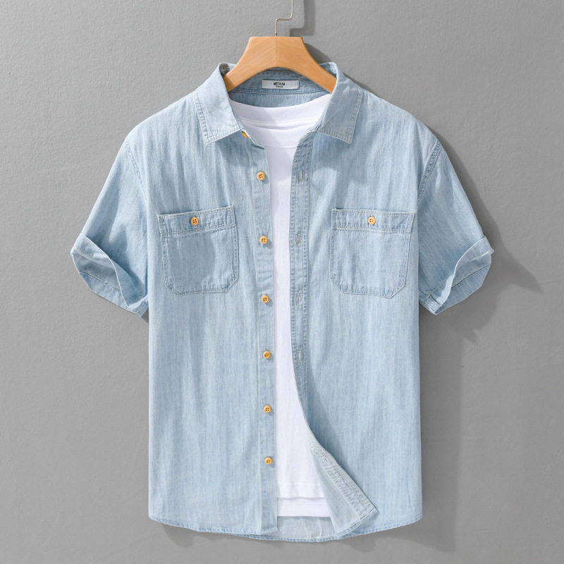 여름 남성 캐주얼 데님 반팔 셔츠 심플하고 다재다능한 패션 남성 순면 청소년 패션 셔츠 9358스토어 가기