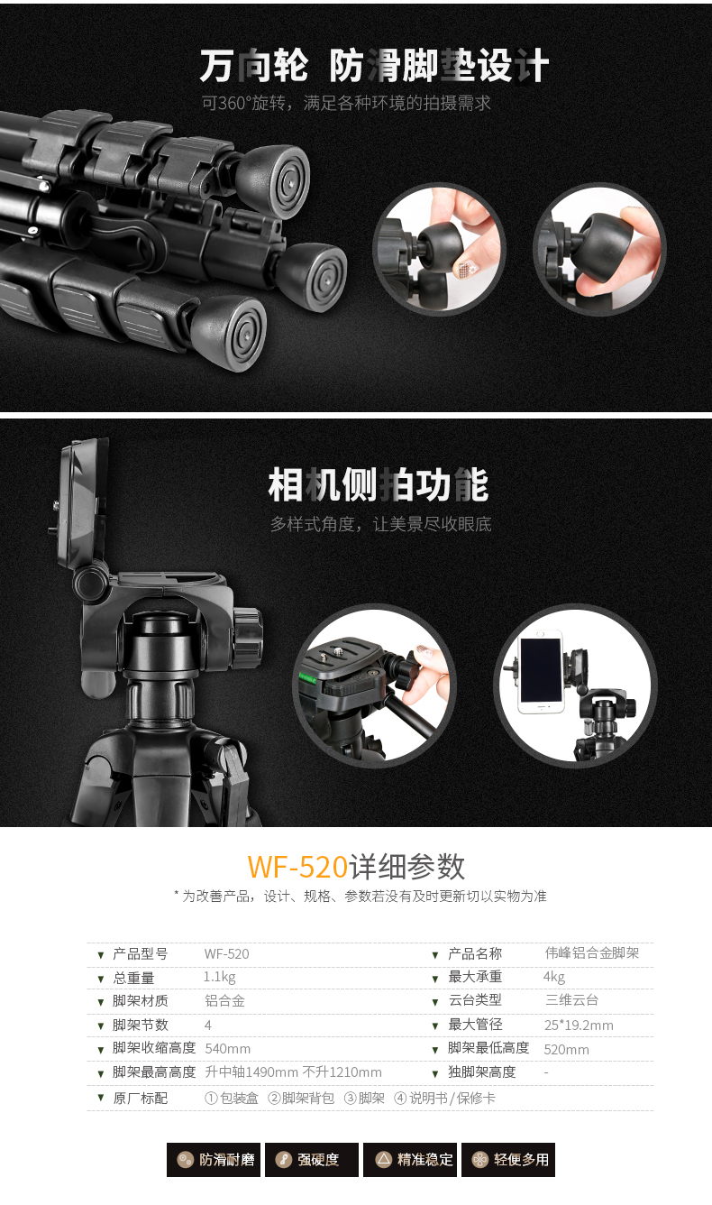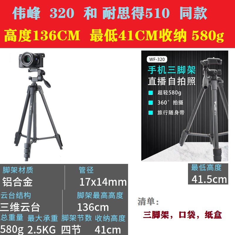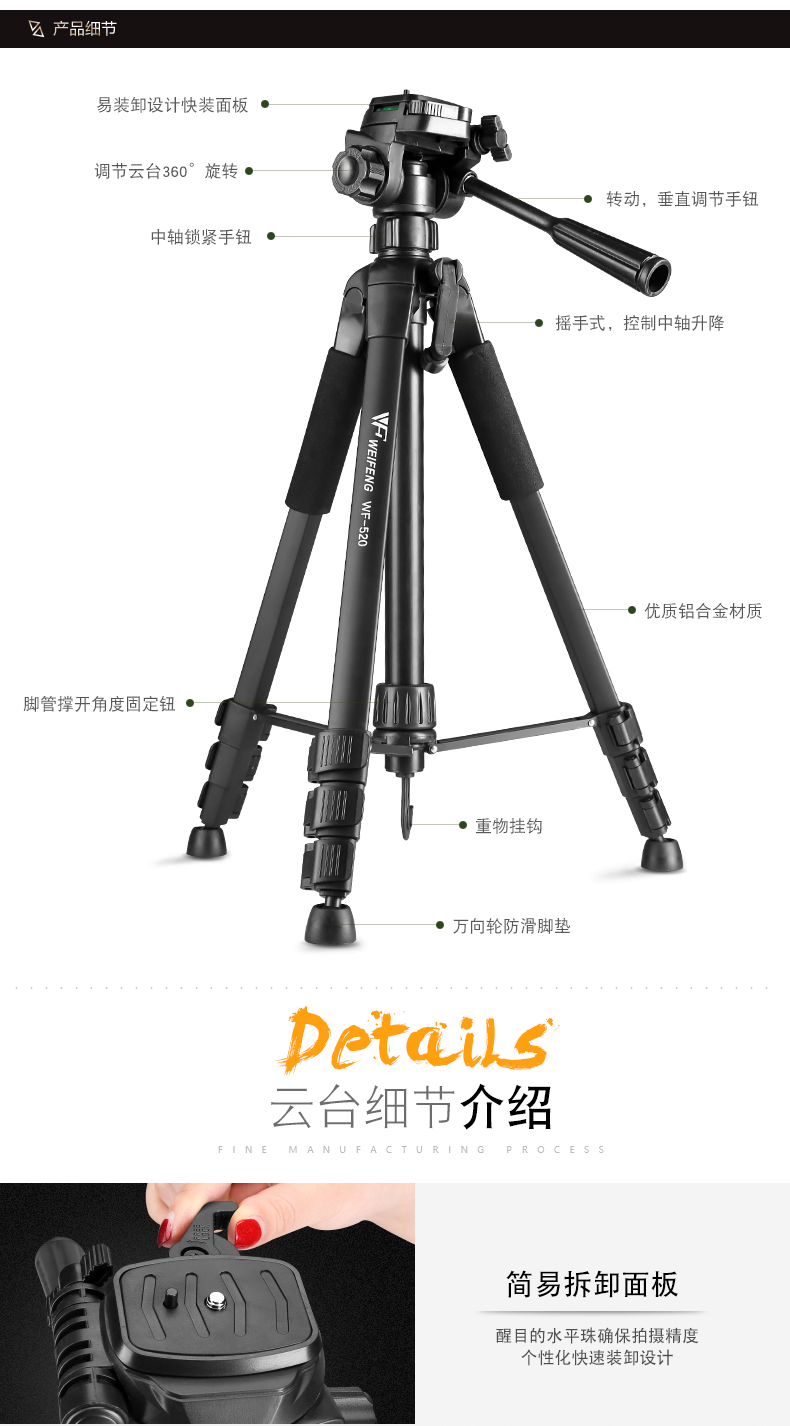 伟峰520型号高度1.5米,结实稳定。540高度160CM,云台可以拆卸,更高一点,结构雷同。