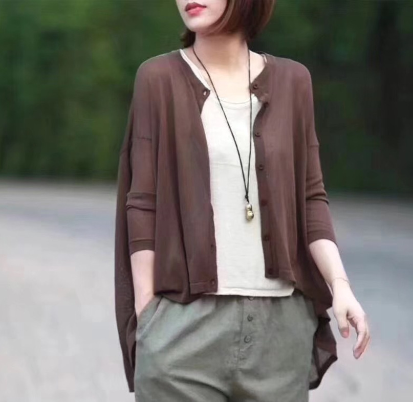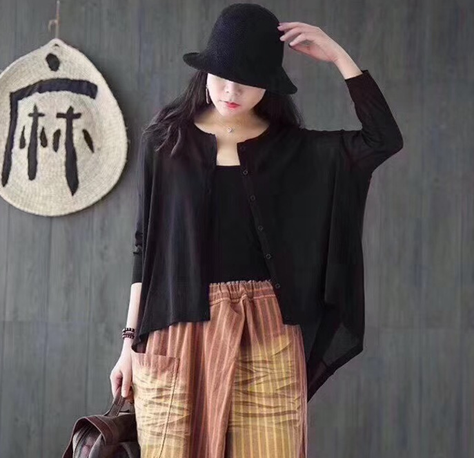 여름 2020 새로운 예술 복고풍 느슨한 플러스 사이즈 불규칙한 얇은 린넨 니트 셔츠 자외선 차단제 의류스토어 가기