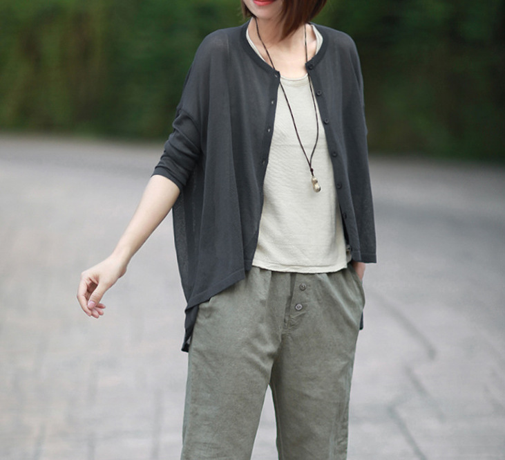 여름 2020 새로운 예술 복고풍 느슨한 플러스 사이즈 불규칙한 얇은 린넨 니트 셔츠 자외선 차단제 의류