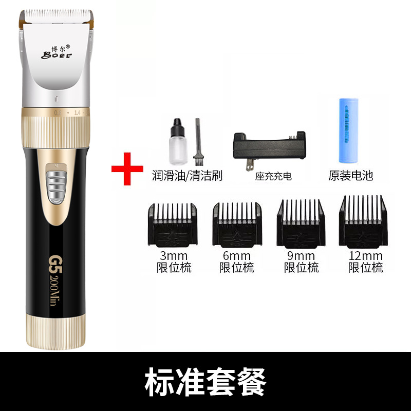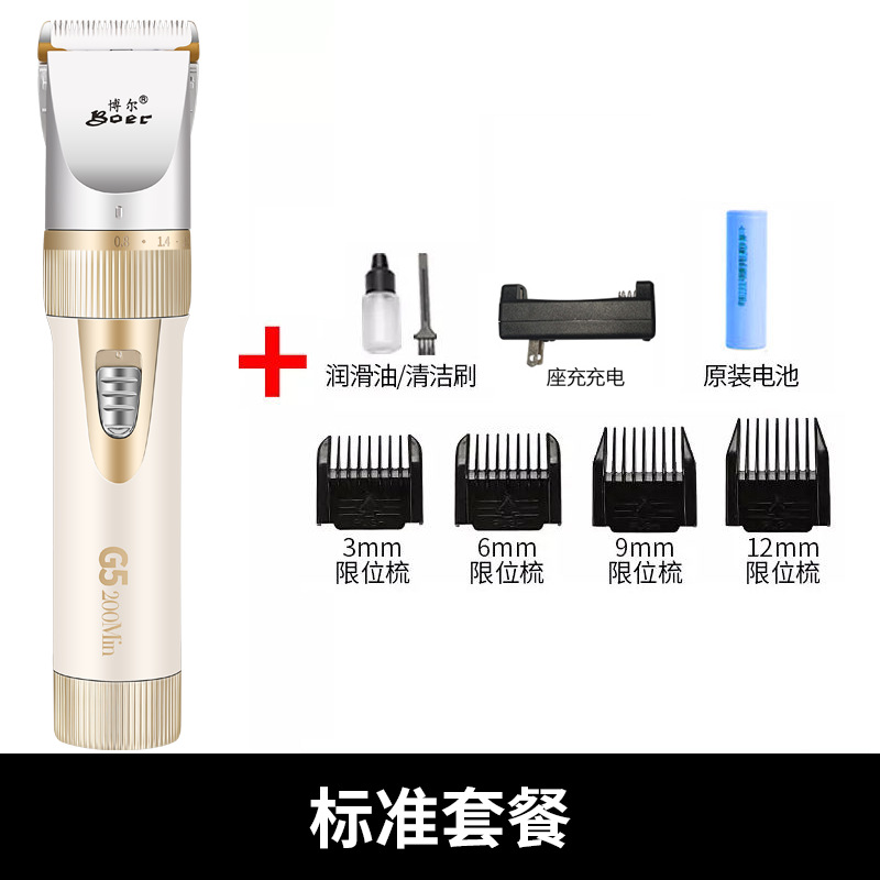 产品配件:包装盒,说明书,4个定位梳,,一个座充,一个备用电池(1500毫安锂电),一瓶润滑油,一只清洁刷。