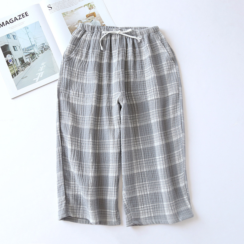 느슨한 파자마 바지 여자의 여름 카프리 바지 일본식 격자 무늬 면 얇은 워싱 크레이프 면사 에어컨 바지