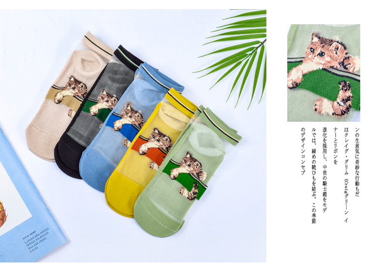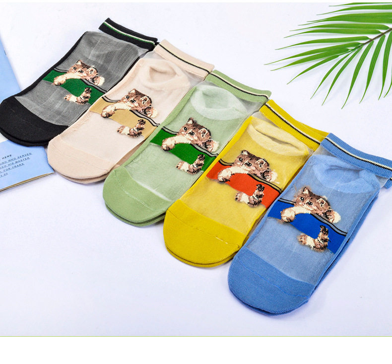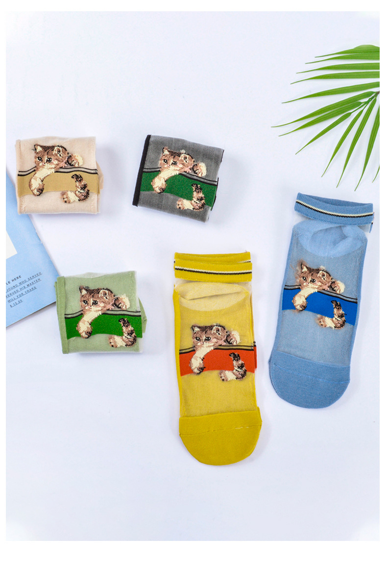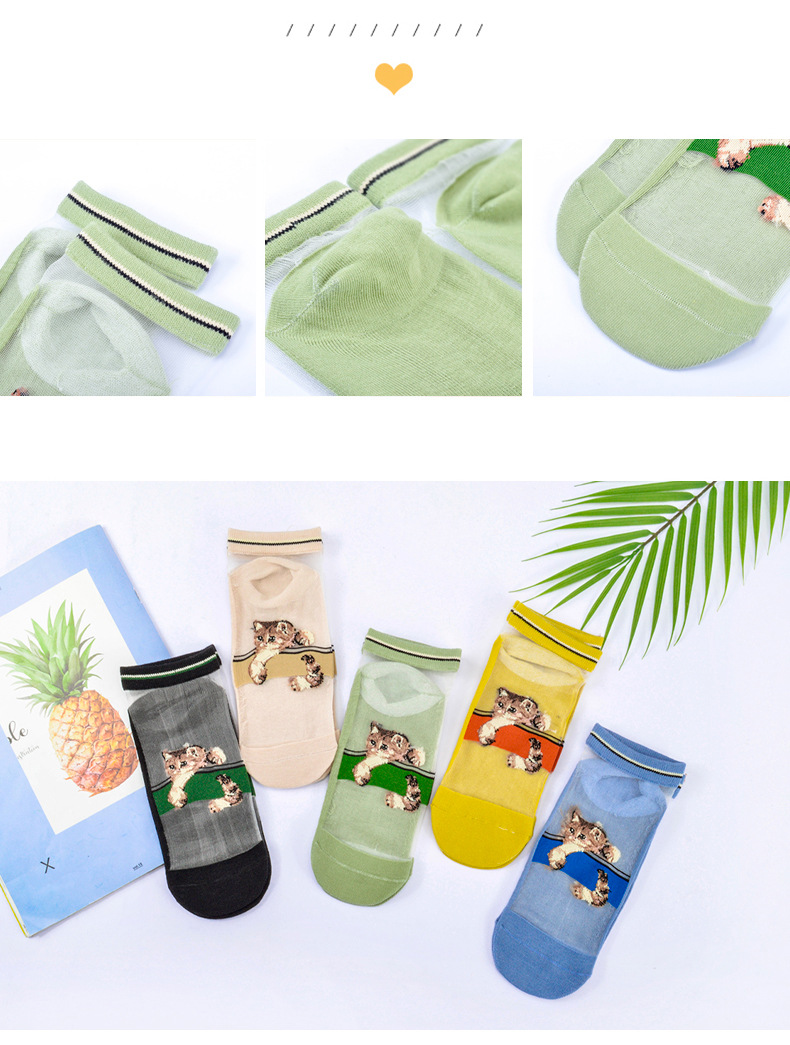 봄과 여름 양말 여성용 짧은 양말 귀여운 일본 크리스탈 실크 투명 실크 새끼 고양이 유리 실크 스타킹 면 바닥 얇은 여름