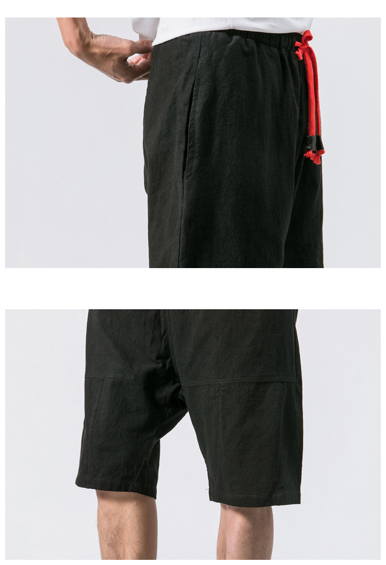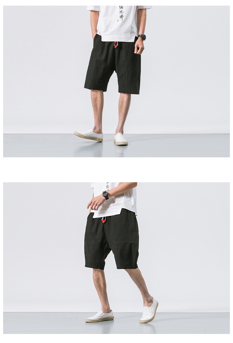 여름 새로운면과 린넨 자른 바지 느슨한 유행 헐렁한 바지 남성 대형 바지 탄성 허리 중국 스타일 비치 바지 남성