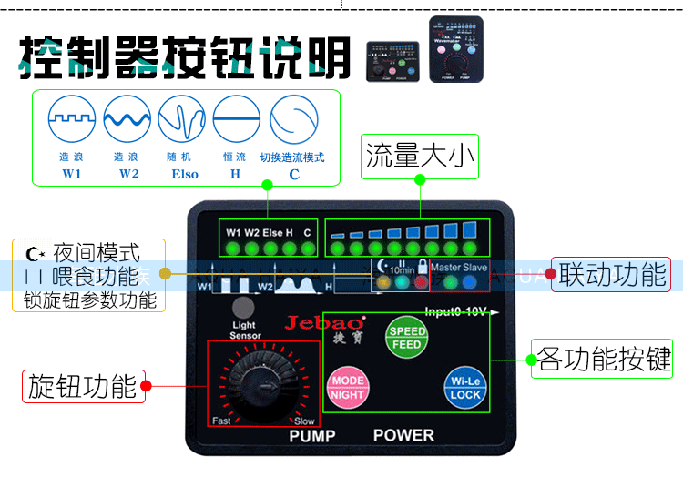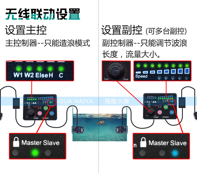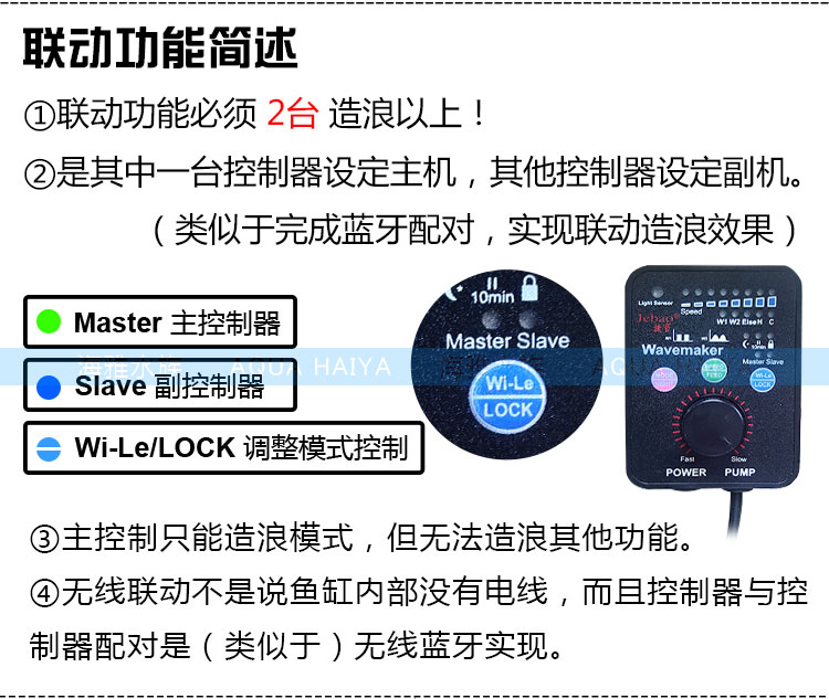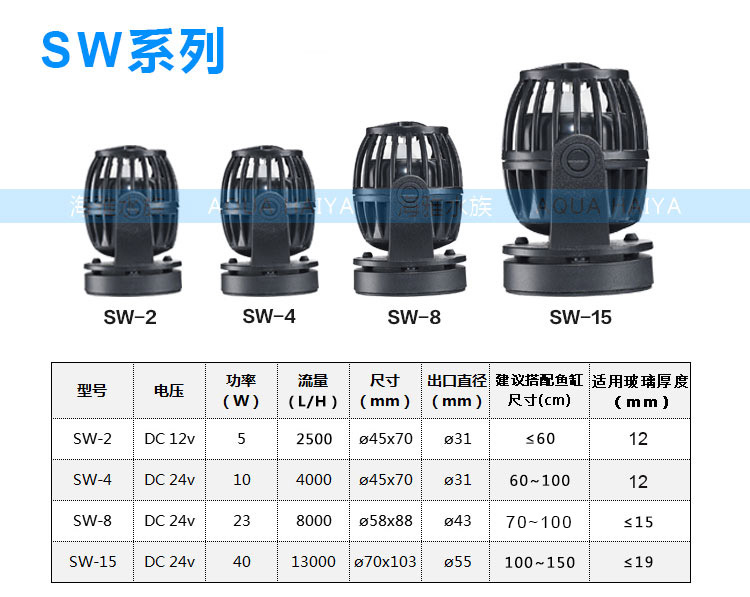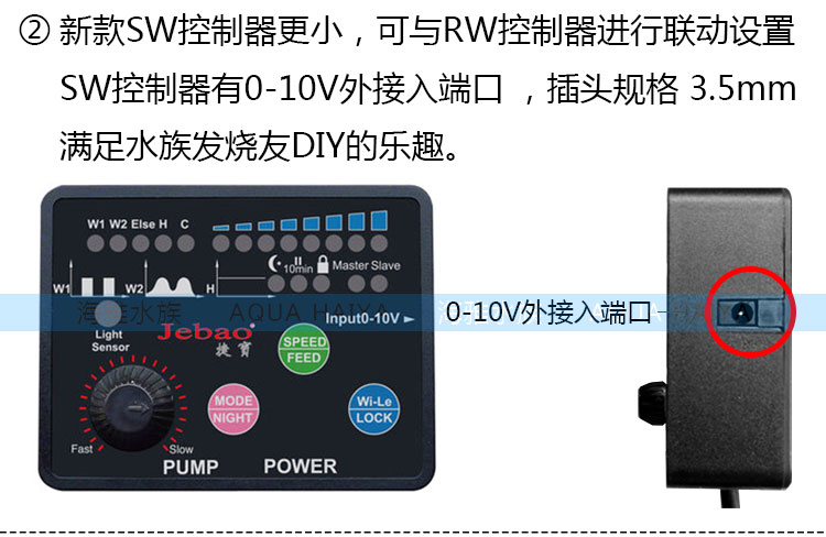 特别注意:无线联动是2台造浪的控制器相互联动功能,并不是说鱼缸内没有线。目前还没有无线驱动电机技术出现。新款SW新增了SW-2(5W)满足小缸海水玩家,新款SW控制器更小,控制器看起来更MINI更时尚,可以与OW,RW可进行联动控制。功能与以前的RW控制器一样!