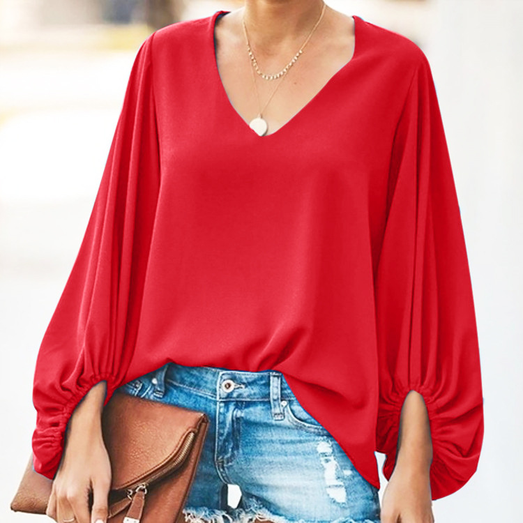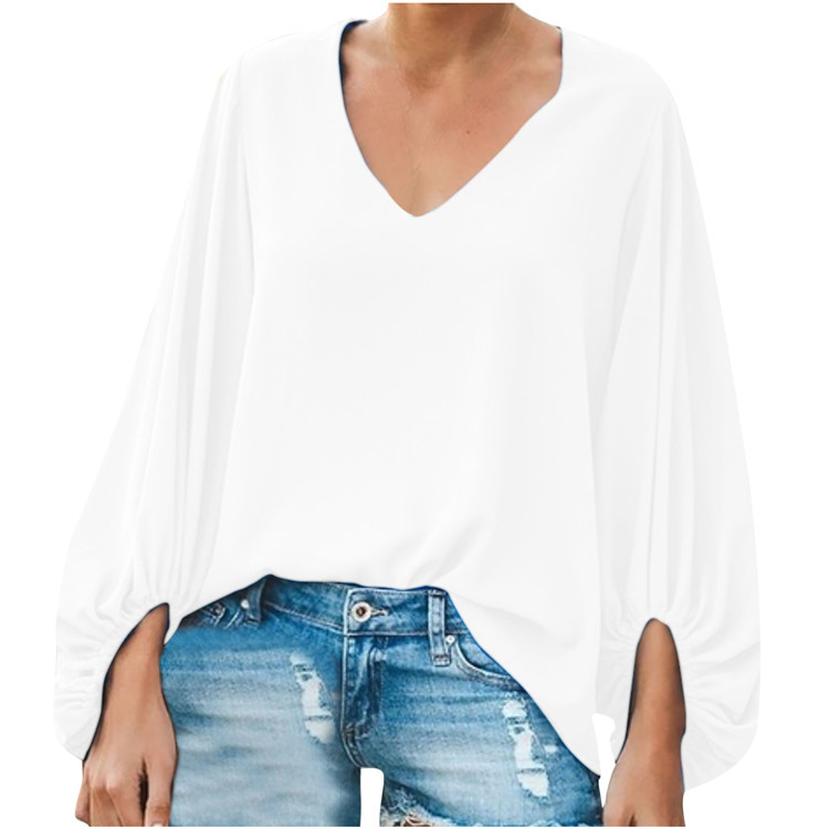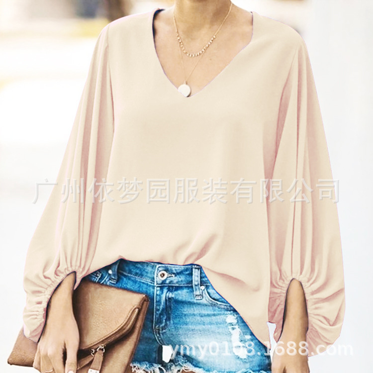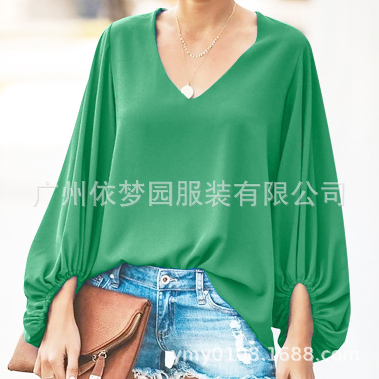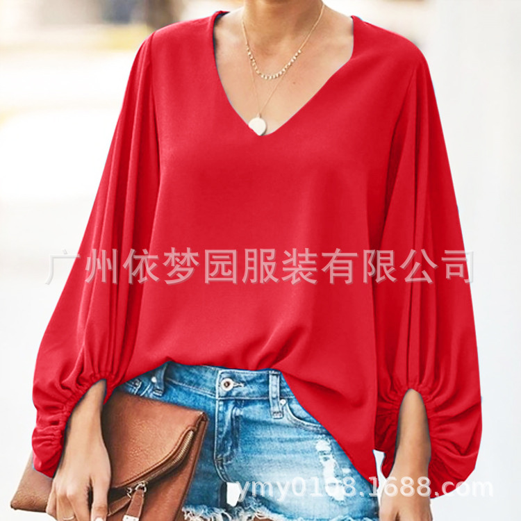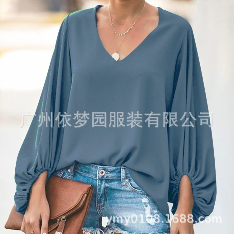 유럽 및 미국 여성복 WISH 2025 여름 신상품 브이넥 랜턴 슬리브 루즈핏 긴팔 빅사이즈 여성 상의