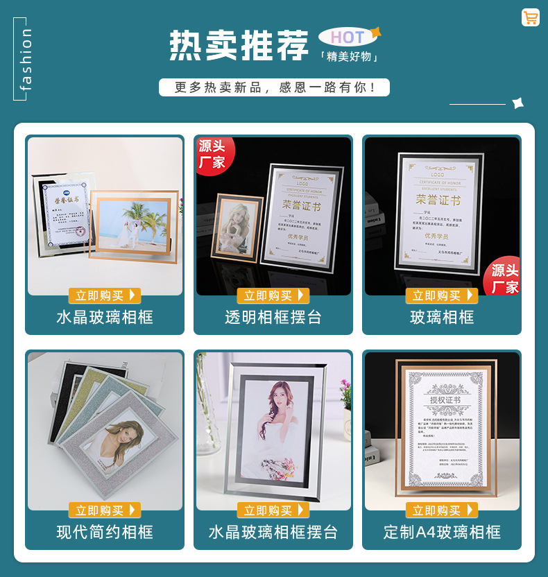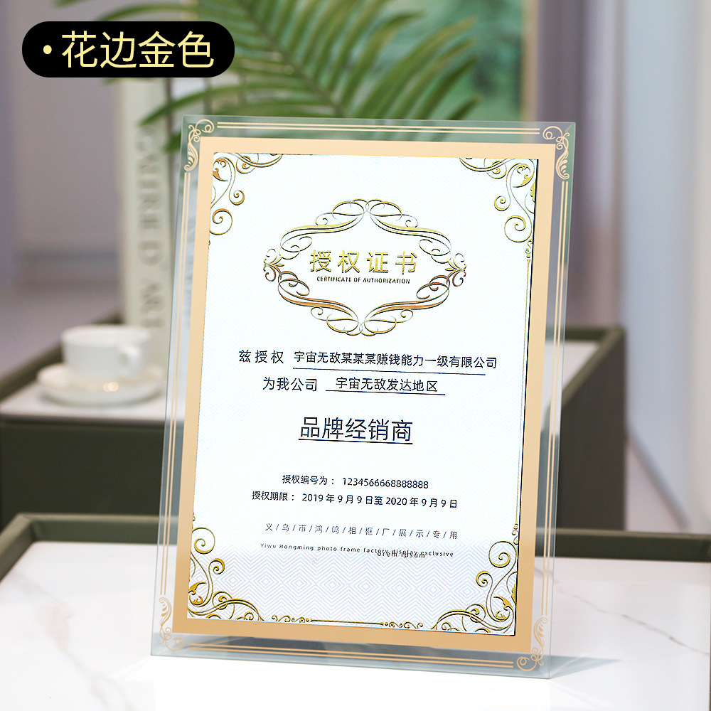 크리스탈 유리 포토 프레임 도매 5 인치 6 인치 7 인치 8 인치 A4 웨딩 사진 스튜디오 라이센스 프레임 명예 증명서스토어 가기