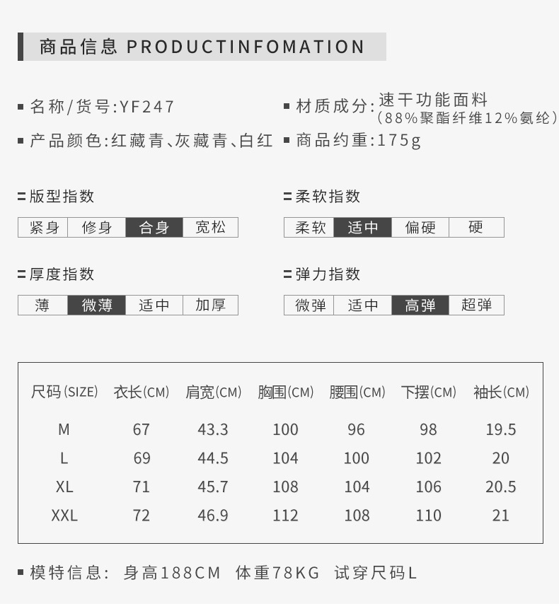 颜 色蓝藏青色,白藏青色,白红色,白灰色面 料88%聚酯纤维+12%氨纶