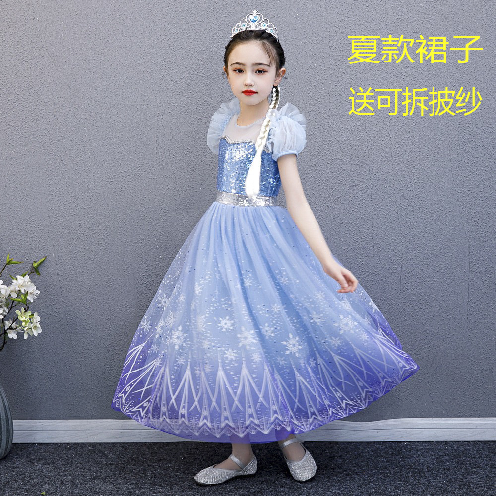 冰雪奇缘2爱莎公主裙印花亮片网纱连衣裙女童短袖大裙摆外贸爆款
