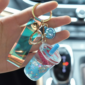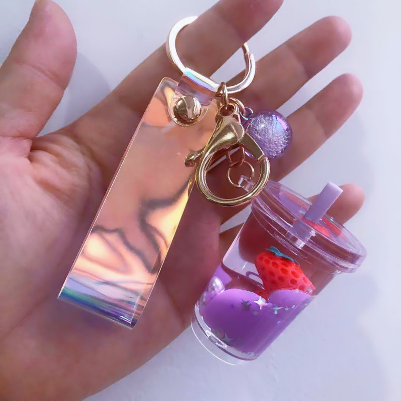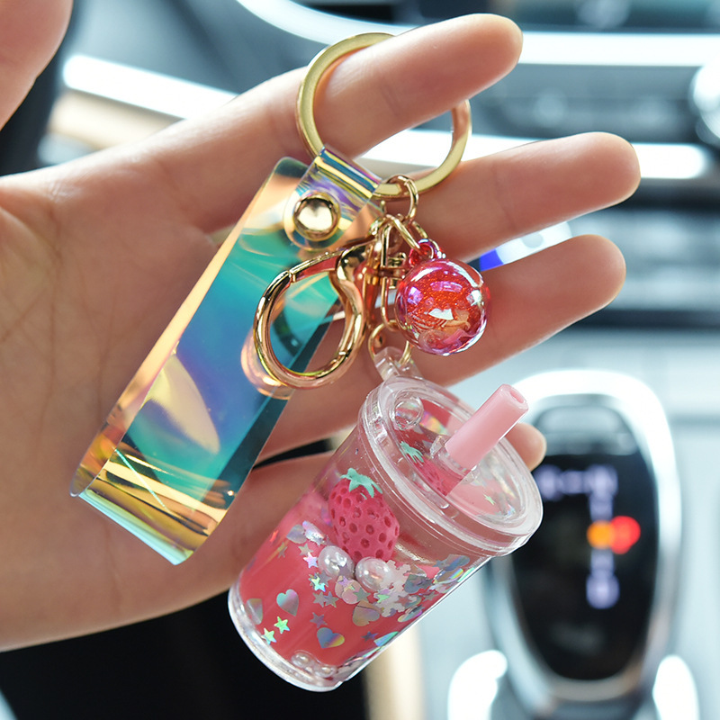 크리 에이 티브 과일 딸기 밀크 티 키 체인 개인 오일 파인애플 아크릴 퀵샌드 백 펜던트 키 체인 링스토어 가기