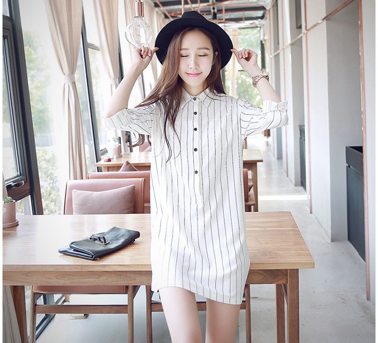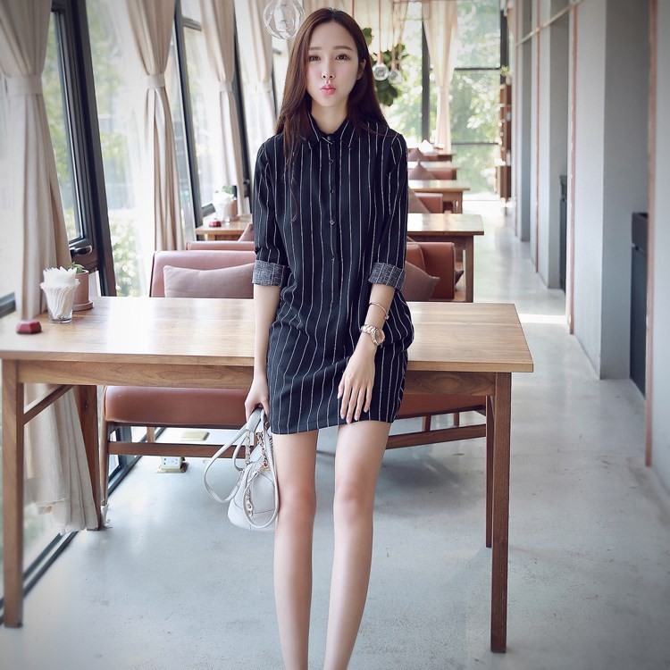 플러스 사이즈 여성 의류 가을 한국 스타일 학생 중간 길이 셔츠 원피스 슬림핏 슬리밍 긴팔 스트라이프 베이스 원피스스토어 가기