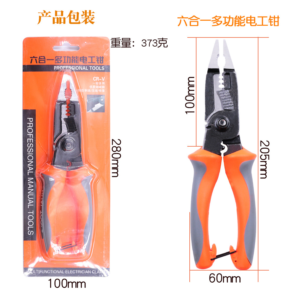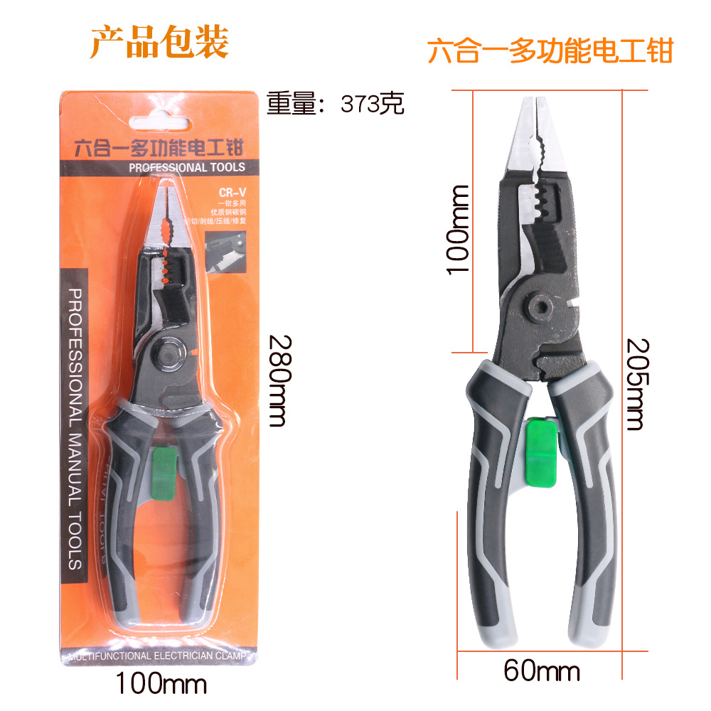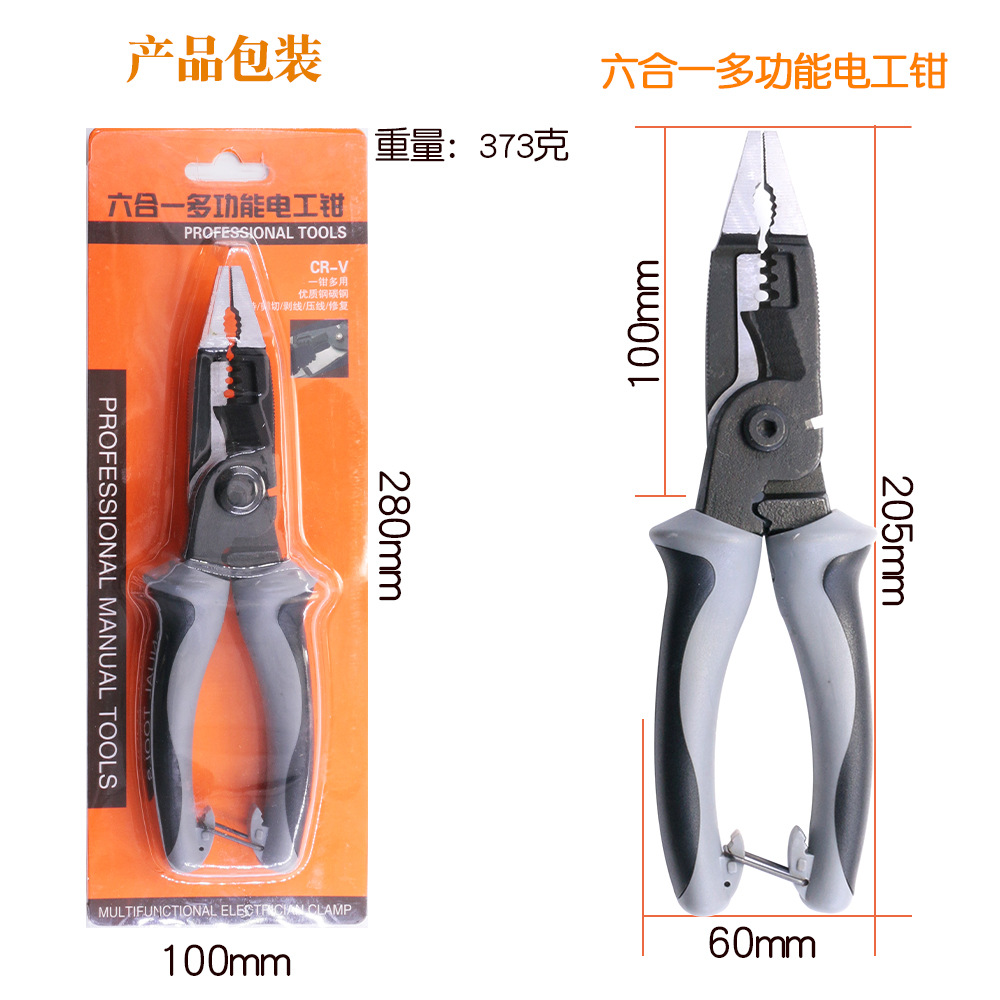 新款多功能六合一电工钳,可用于剪钢丝,铁丝,剥线,剪线,夹持,缠绕,除毛刺,电工工人备选产品。