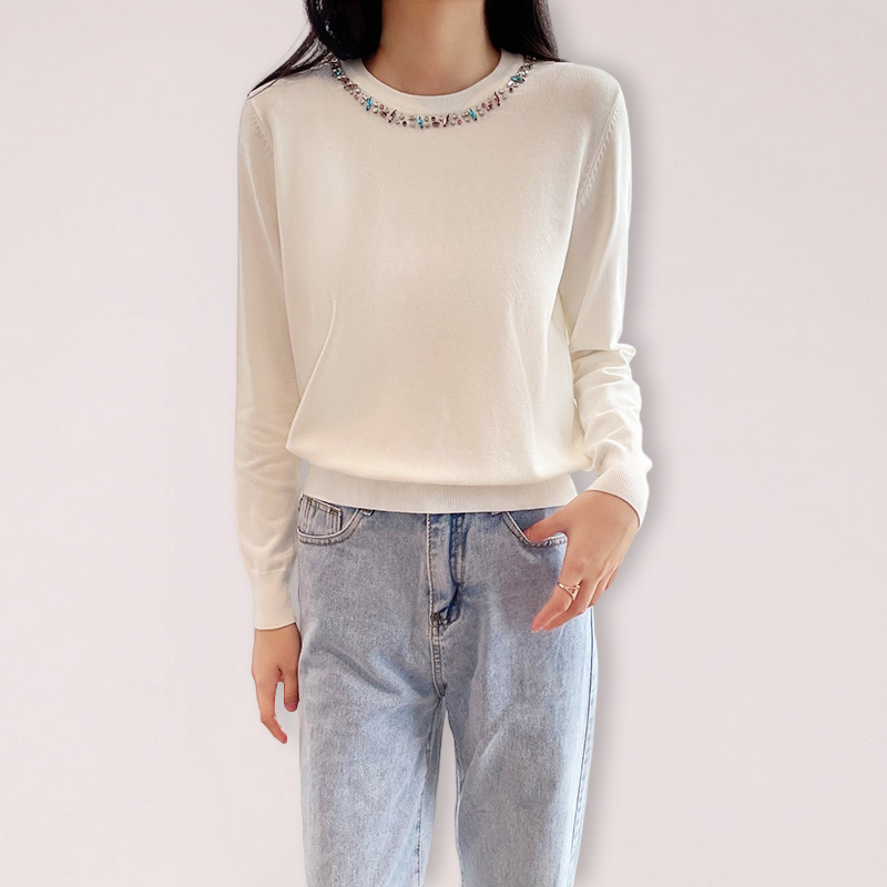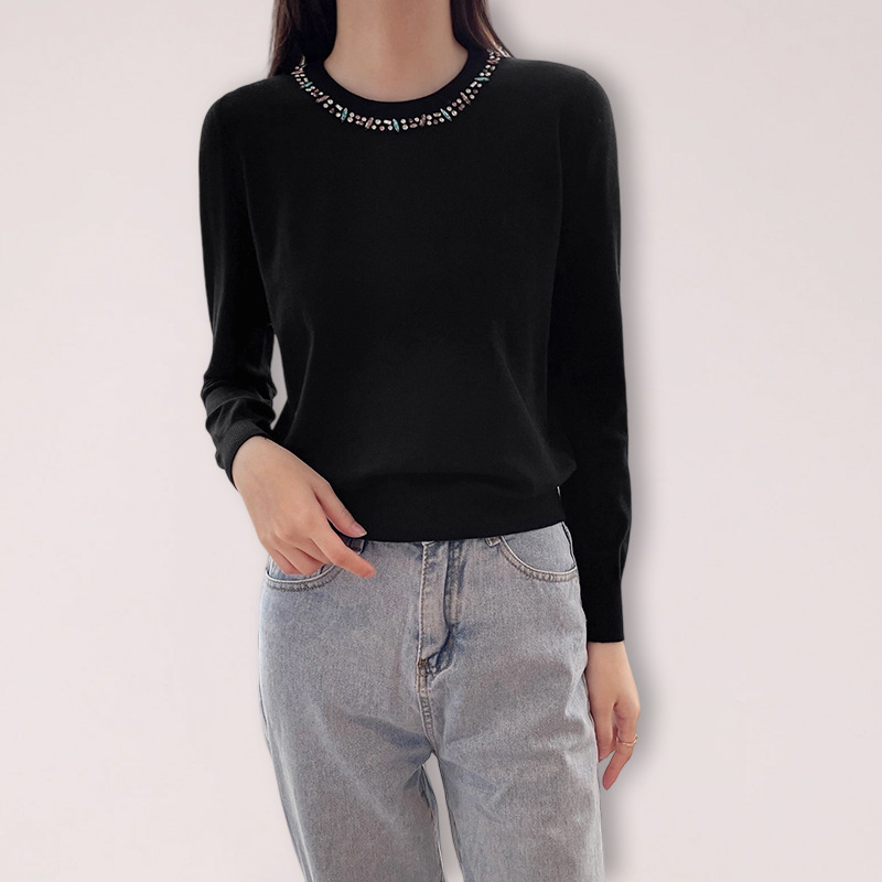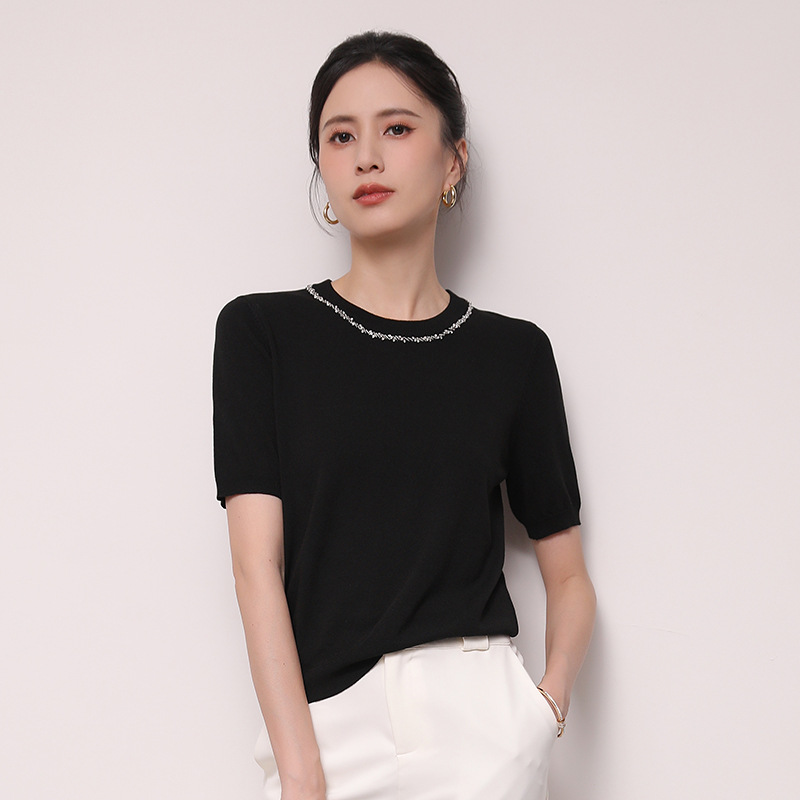 여름 아이스 실크 니트 반팔 여성용 티셔츠 단색 구슬 둥근 목 스웨터 넓은 느슨한 어깨 탑 도매스토어 가기