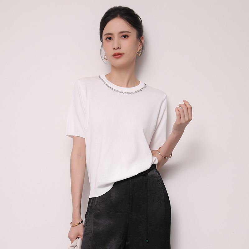 여름 아이스 실크 니트 반팔 여성용 티셔츠 단색 구슬 둥근 목 스웨터 넓은 느슨한 어깨 탑 도매