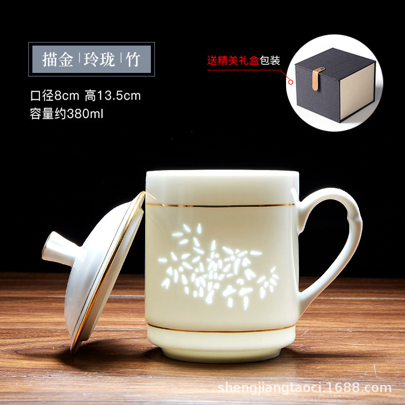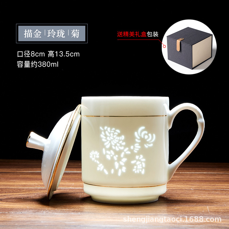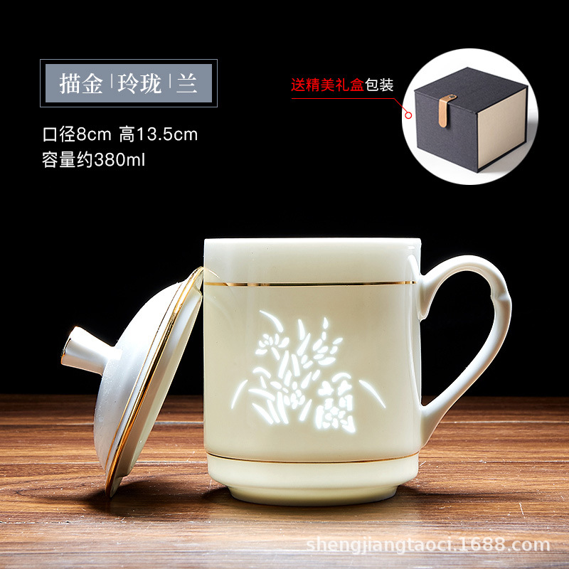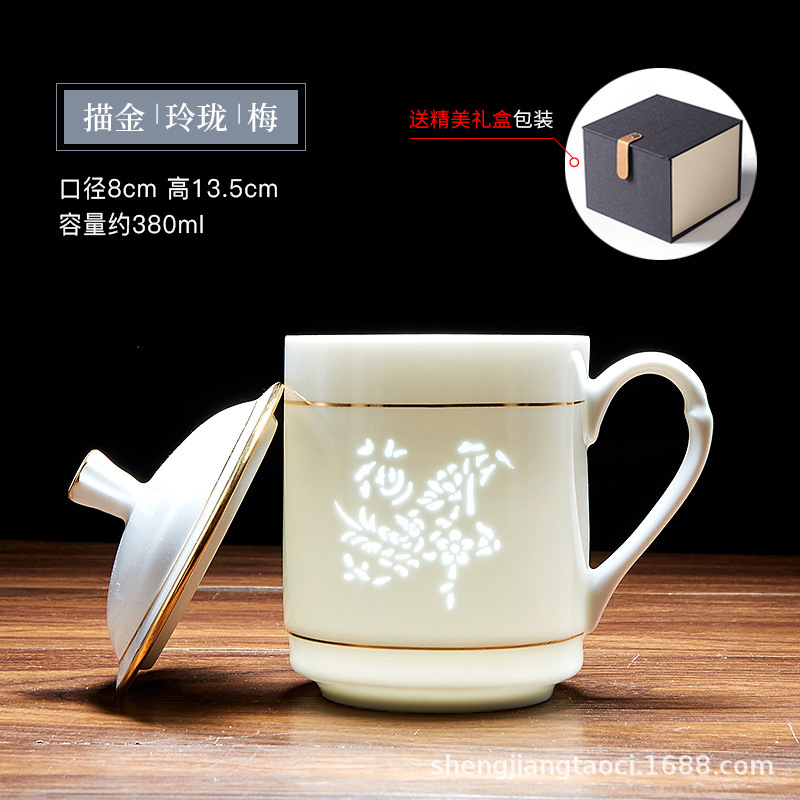 Jingdezhen 세라믹 티 컵 오피스 컵 뚜껑 컨퍼런스 컵 손으로 그린 매화, 난초, 대나무 및 국화 절묘한 골드 컵이있는 가정용 워터 컵