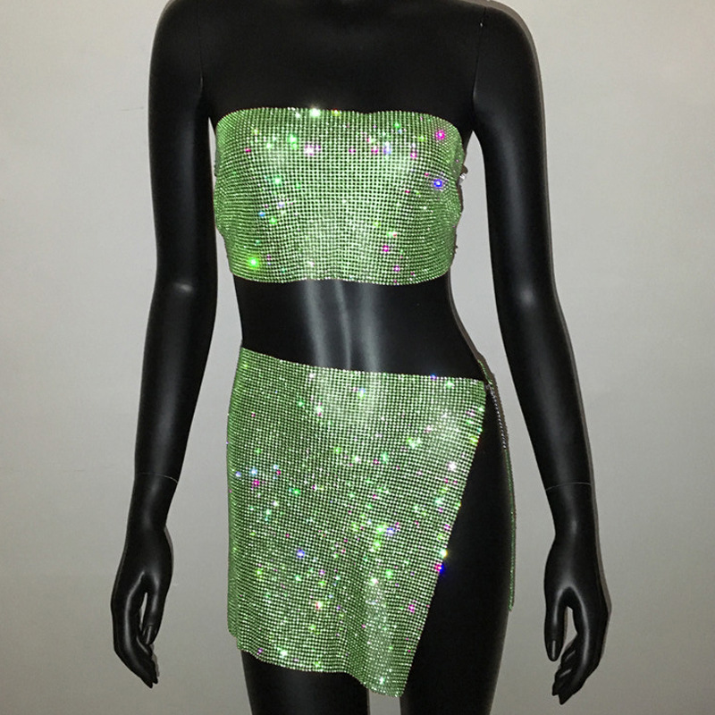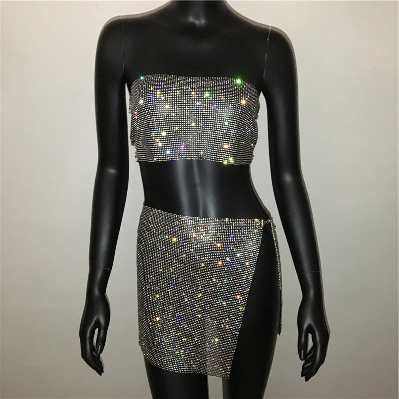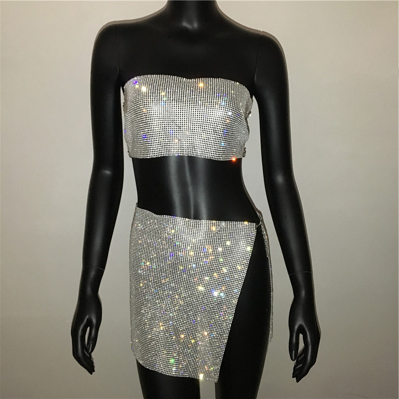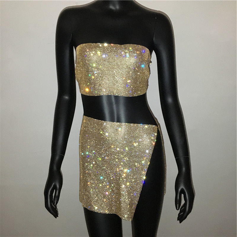 국경 간 폭발 유럽과 미국 여성의 금속 모조 다이아몬드 탑 스커트 세트 섹시한 나이트 클럽 파티 핫 걸 모조 다이아몬드 스커트
