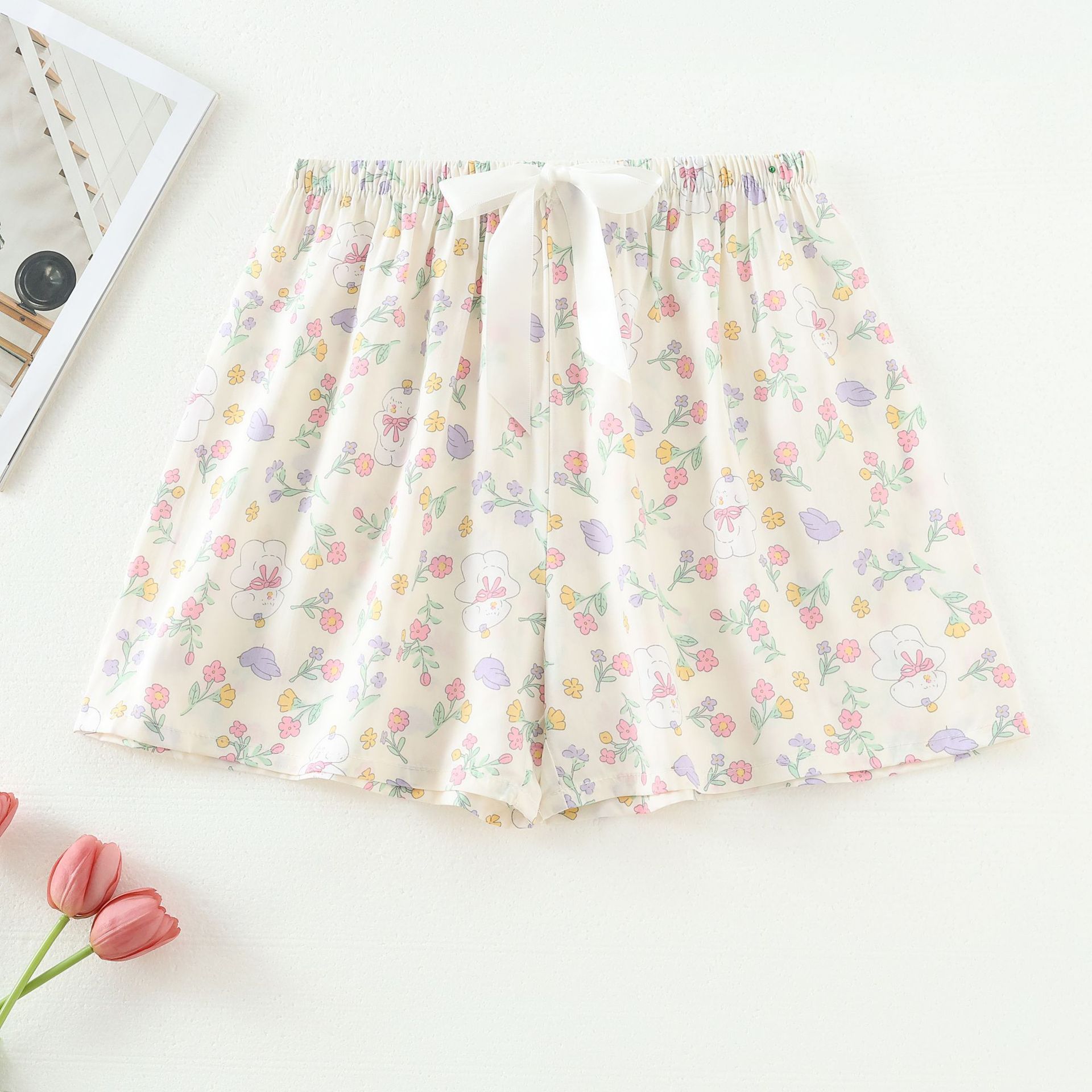 공장 직접 공급 면 실크 반바지 여성 여름 얇은 일본 꽃 드레이프 탄성 허리 잠옷 인공 면 싱글 바지