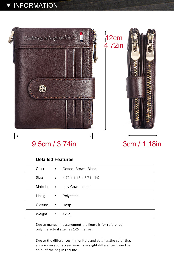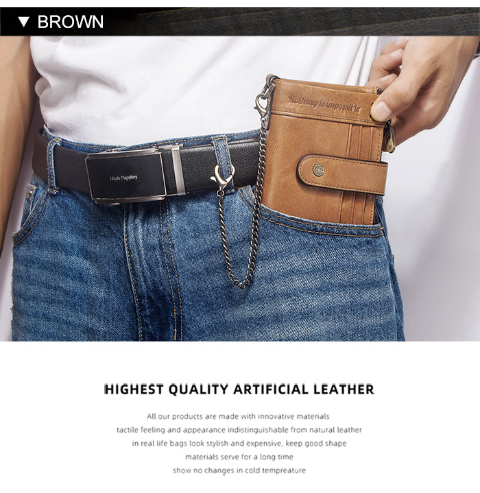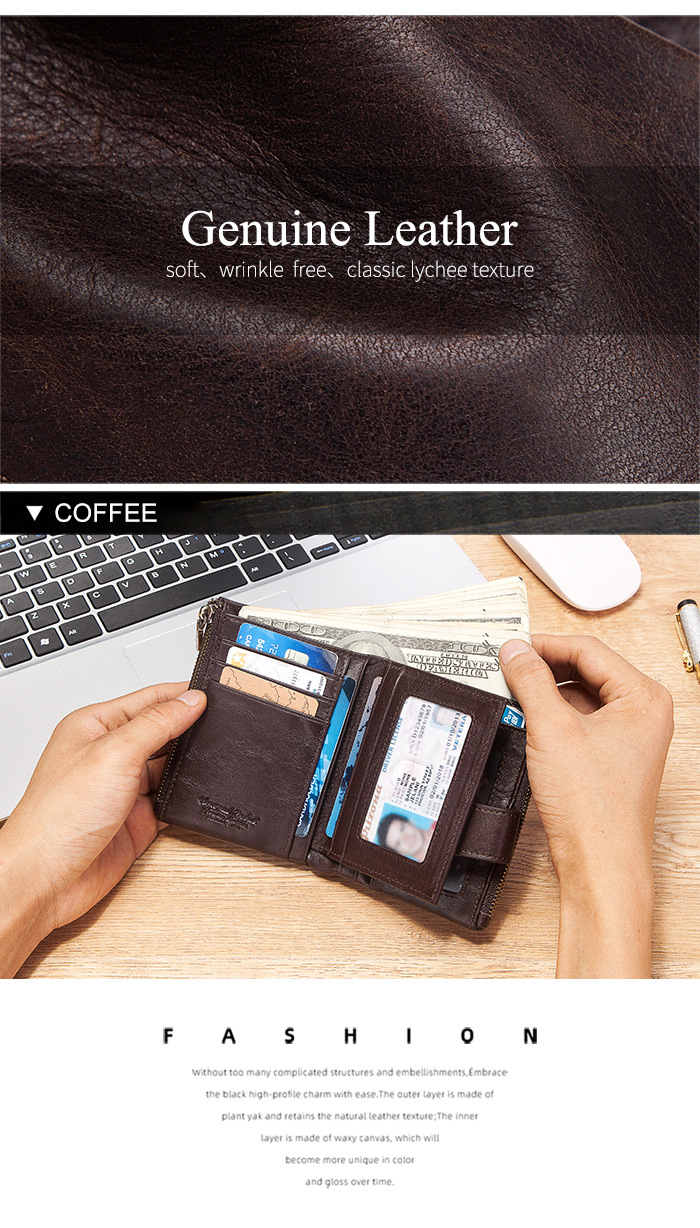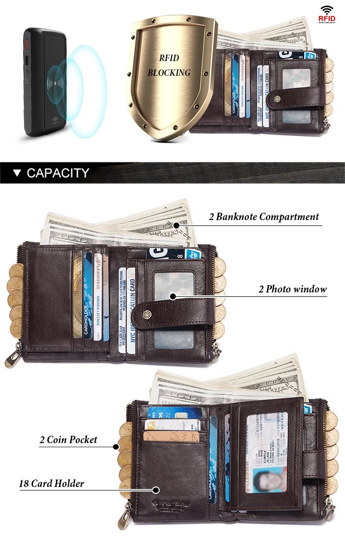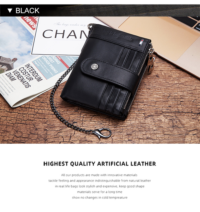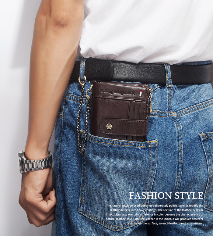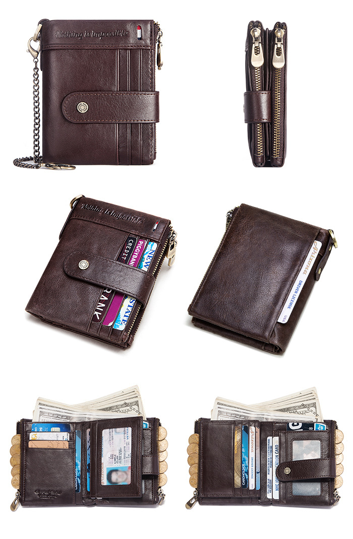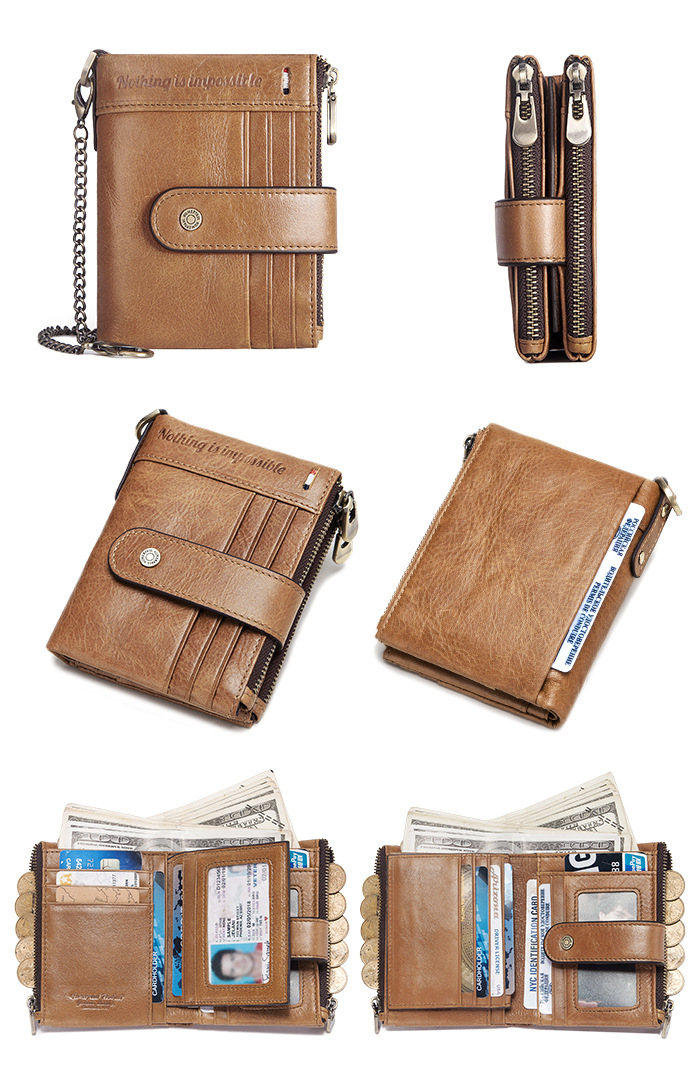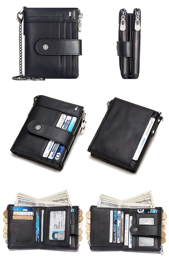 RFID 정품 가죽 다중 카드 슬롯 신분증 카드 지갑, 1등급 소가죽 남성용 지갑, 이중 지퍼 동전 주머니, 도난 방지 체인 가방스토어 가기