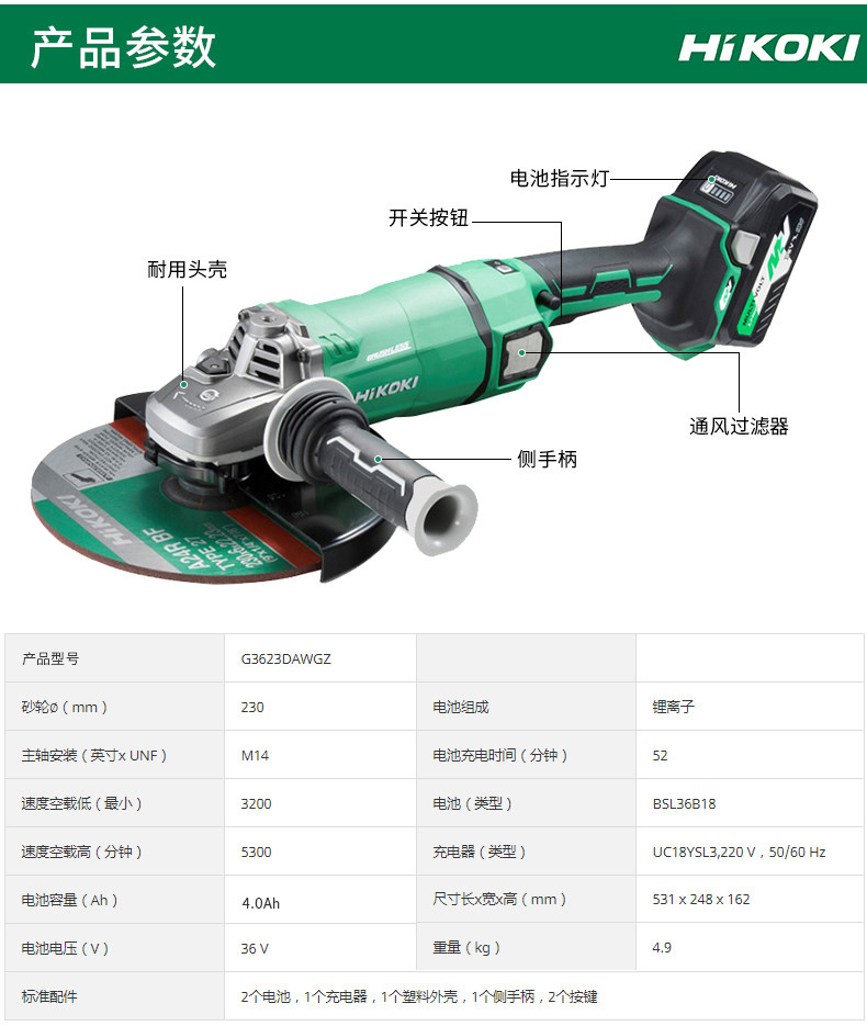 히타치 히타치 앵글 그라인더 G3623DA 브러시리스 충전식 36V 그라인더 230 연마 및 절단기