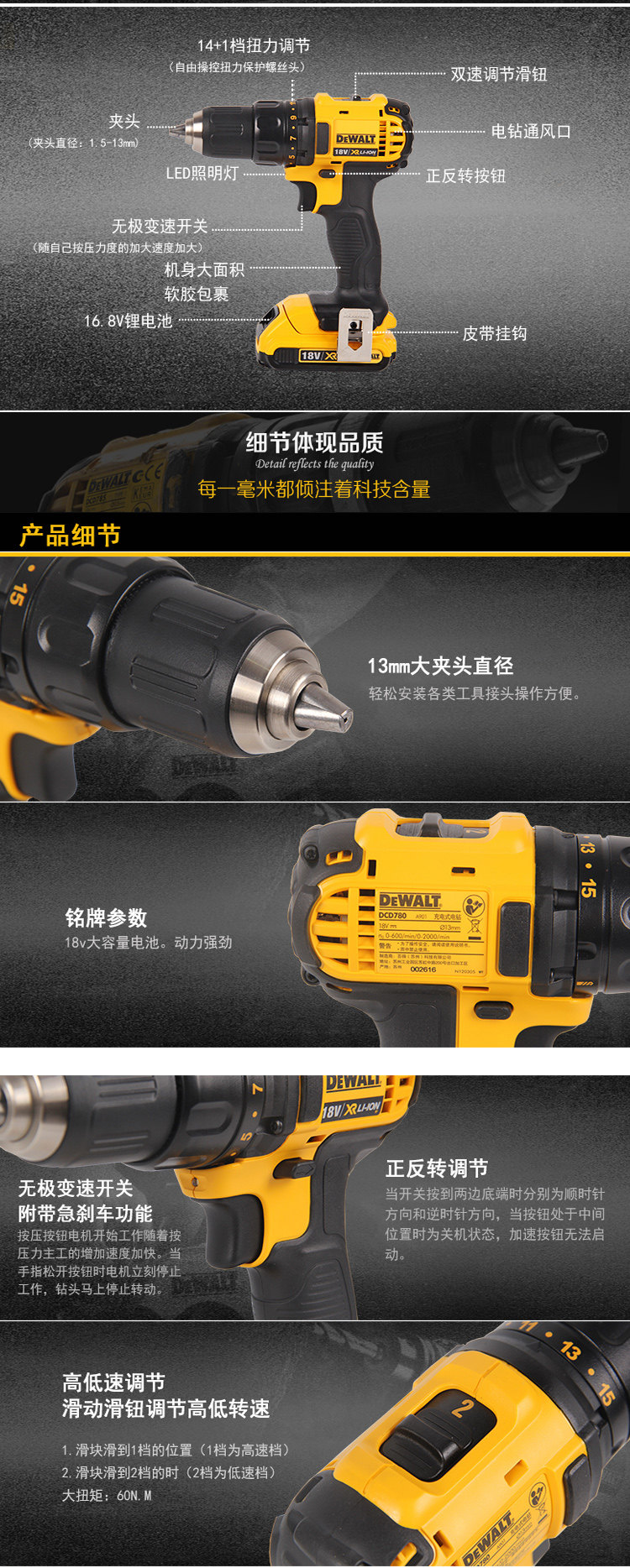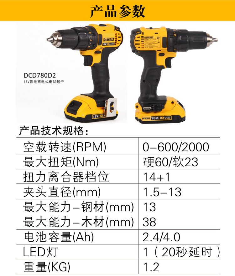 DEWALT (DEWALT)13mm18V 리튬 충전식 핸드 전동 드릴 드라이버 전동 드라이버 DCD780D2