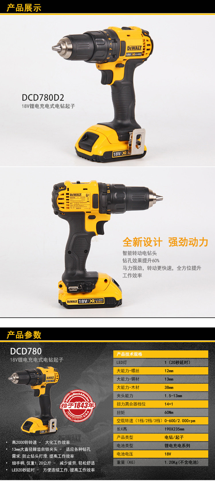 DEWALT (DEWALT)13mm18V 리튬 충전식 핸드 전동 드릴 드라이버 전동 드라이버 DCD780D2스토어 가기