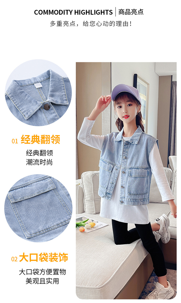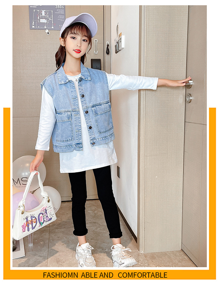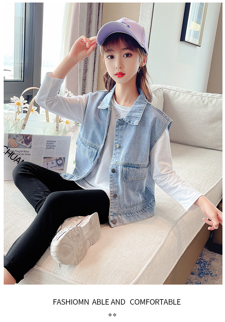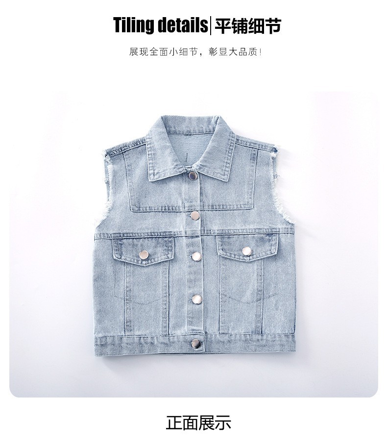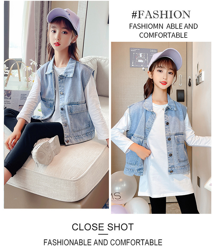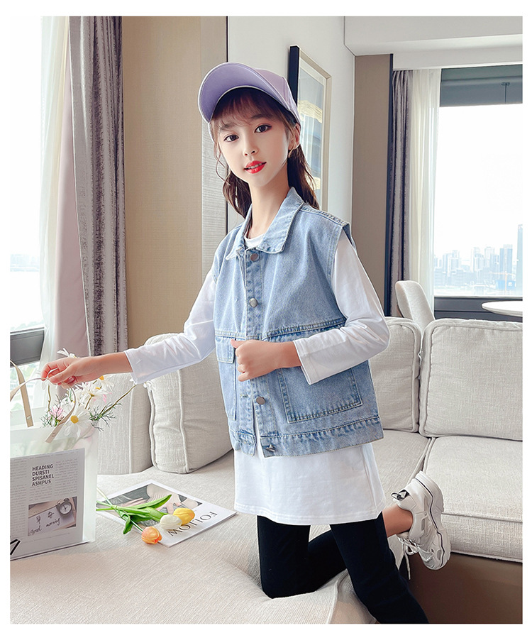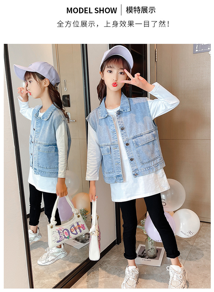 어린이 데님 조끼 톱 2024 봄 새 소녀 한국어 버전의 봄과 가을 양복 조끼 단색 데님 재킷스토어 가기