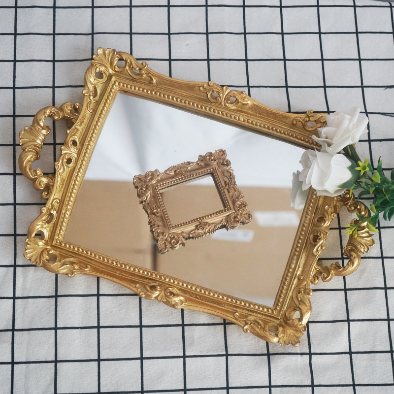 유럽 복고풍 직사각형 황금 거울 트레이 홈 거실 달콤한 가게 수지 공예 트레이 장식품