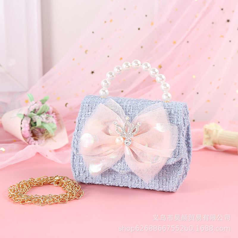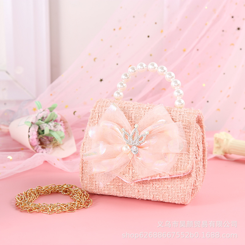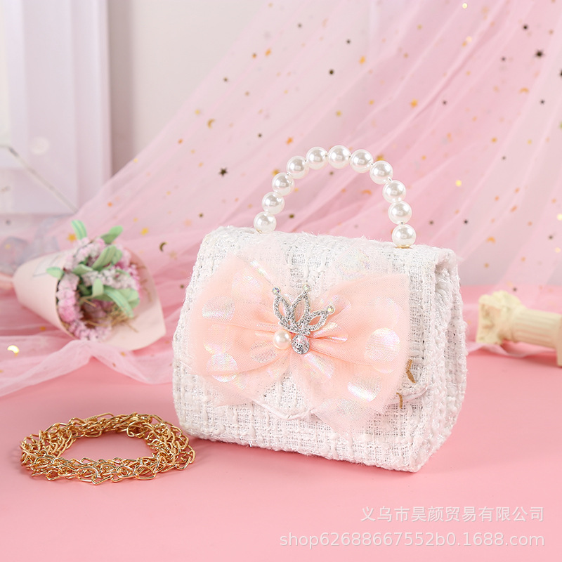 샤넬 스타일 어린이 왕관 다채로운 활 부티크 패션 트렌드 소녀를위한 휴대용 진주 크로스 바디 백 714