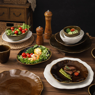 复古异形陶瓷西餐牛排盘电镀金轻奢风西餐沙拉碗马克杯高颜值摆盘