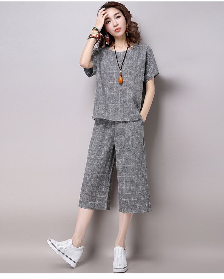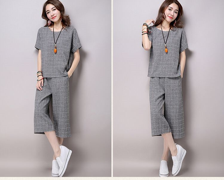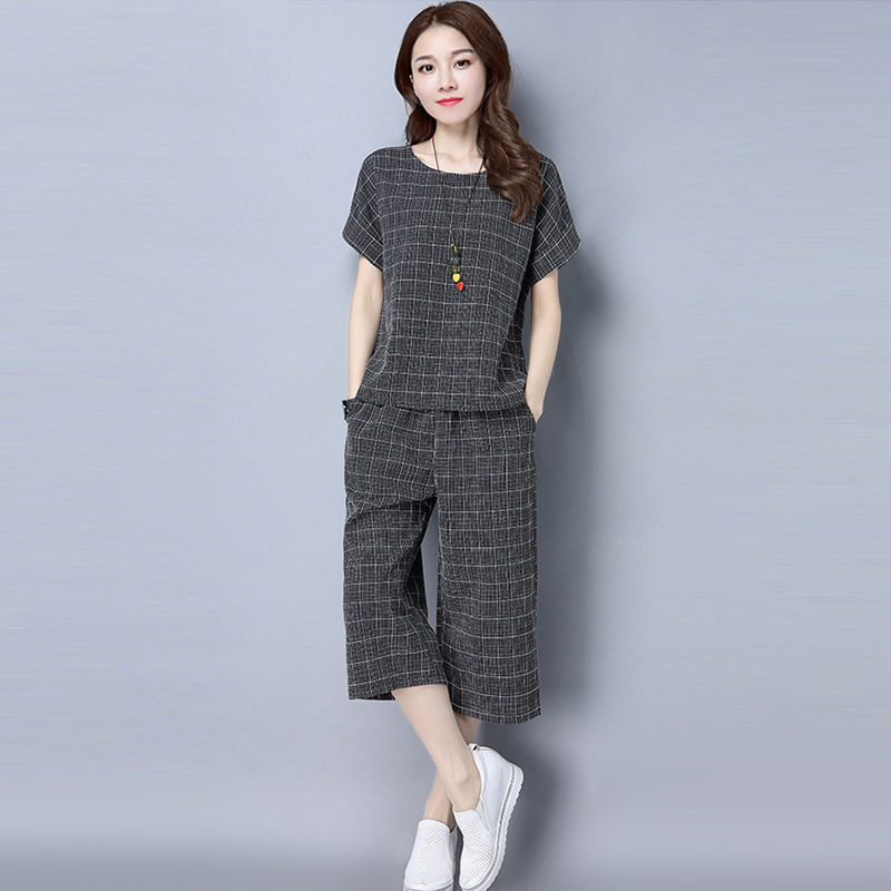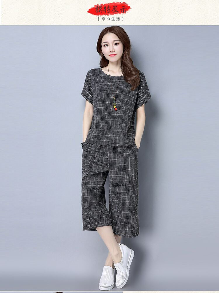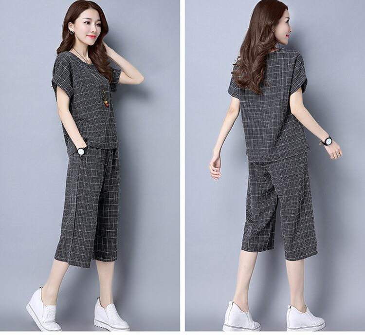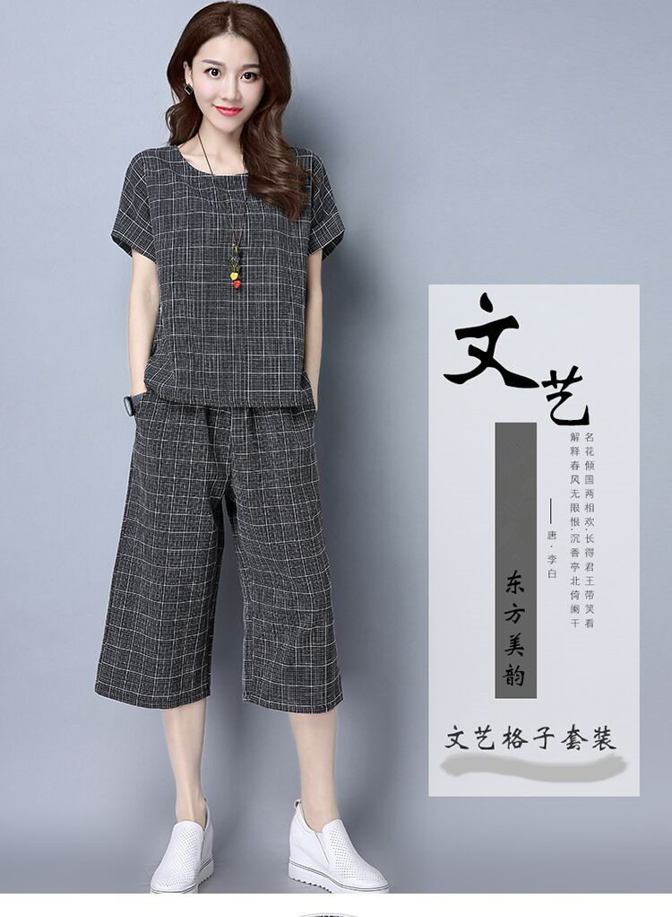 플러스 사이즈 여자의 예술적인 복고풍 느슨한 슬리밍 크롭 와이드 레그 팬츠 반팔 격자 무늬 티셔츠 투피스 세트 세트 New