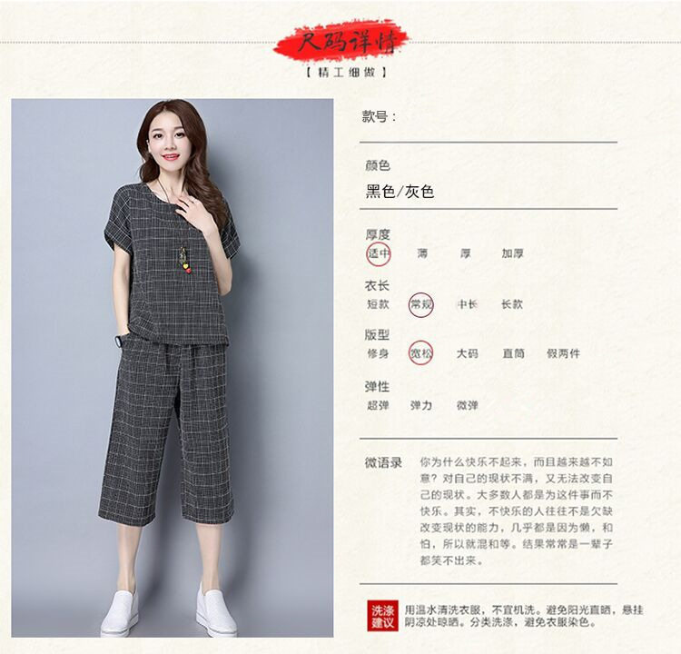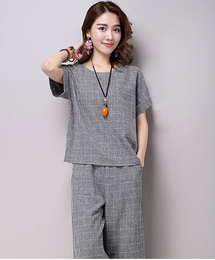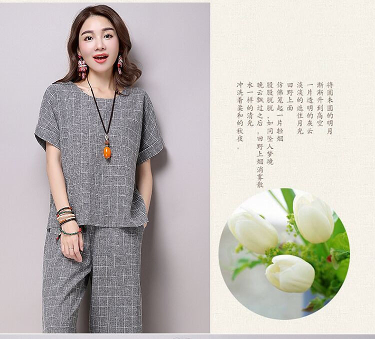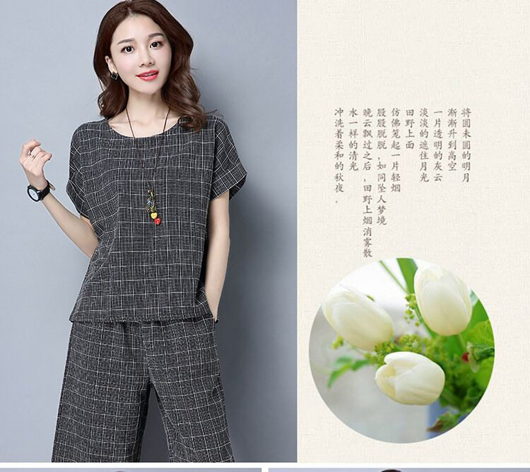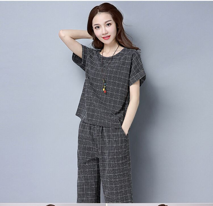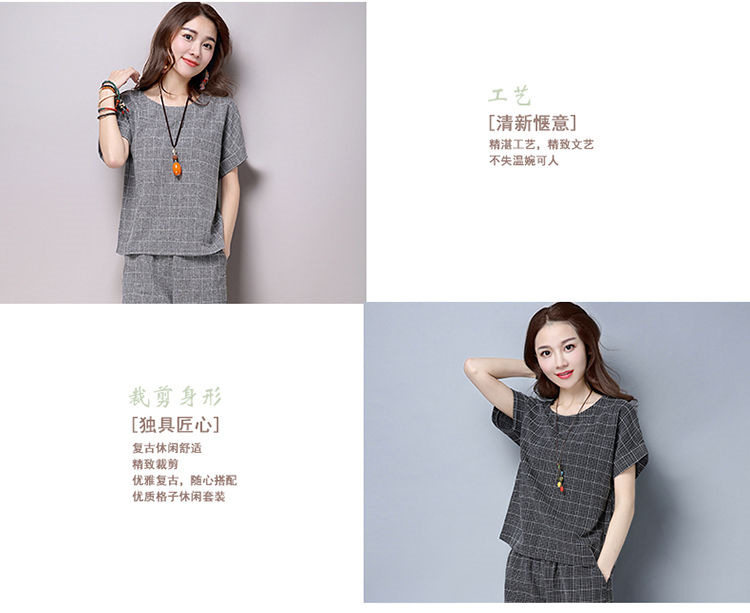 플러스 사이즈 여자의 예술적인 복고풍 느슨한 슬리밍 크롭 와이드 레그 팬츠 반팔 격자 무늬 티셔츠 투피스 세트 세트 New