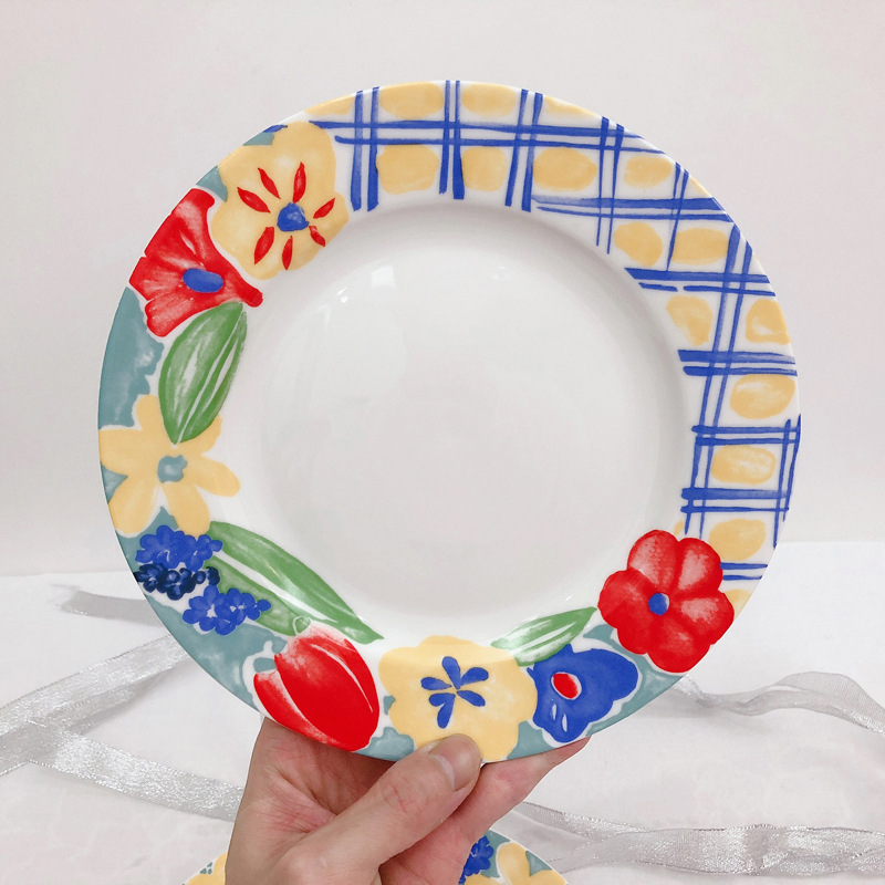 한국 in 빈티지 손으로 그린 유화 격자 무늬 세라믹 수프 접시 서양 음식 접시 가정용 접시 케이크 스테이크 디저트 접시
