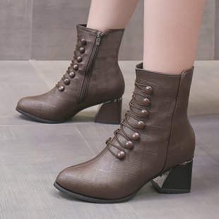 女短靴2020秋冬新款皮面尖头女鞋排扣粗跟加绒短靴中跟时装女靴子 RMB:35