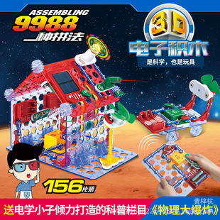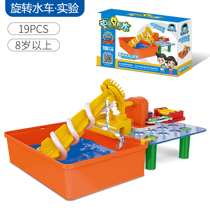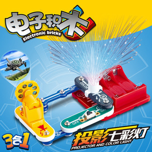 电子积木就是将导线、灯泡、电阻、电容、各种开关、电表、电机、喇叭、集成块等电子元器件固定在塑料片(块)上,用独特的子母扣做成独立可拼装的配件,在产品配置的安装底板上像拼积木一样拼装电路组合。
