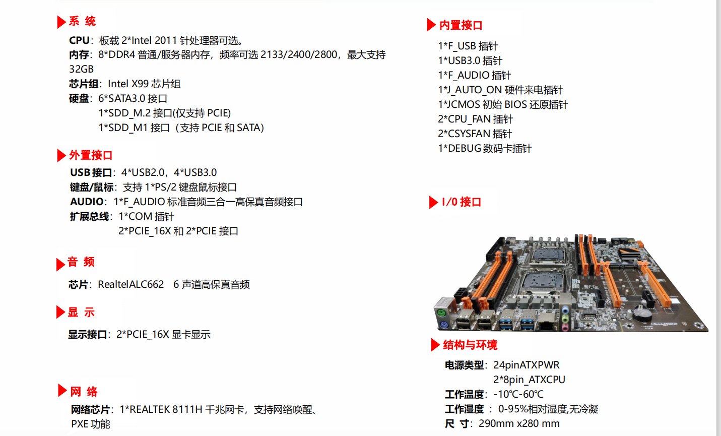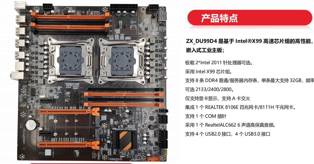 X99双路主板是一款采用Intel 2011处理器+X99芯片组的高性能双路CPU工业级主板,使用双CPU设计使性能猛如虎,内置高规格7+7相供电使运行更稳定更具高性能,固态硬盘传输更出色,设计双通道模式使传输速率更快,单条内存最大支持32GB内存,板载1个全百兆或者千兆网卡、支持网络唤醒、PXE启动;提供4个PCIE插槽,X99双路以其价格、高性能和丰富的扩展接口等特点可适用于工作室多开,云计算、后期动画,图形处理制作以及各种终端机市场等行业。