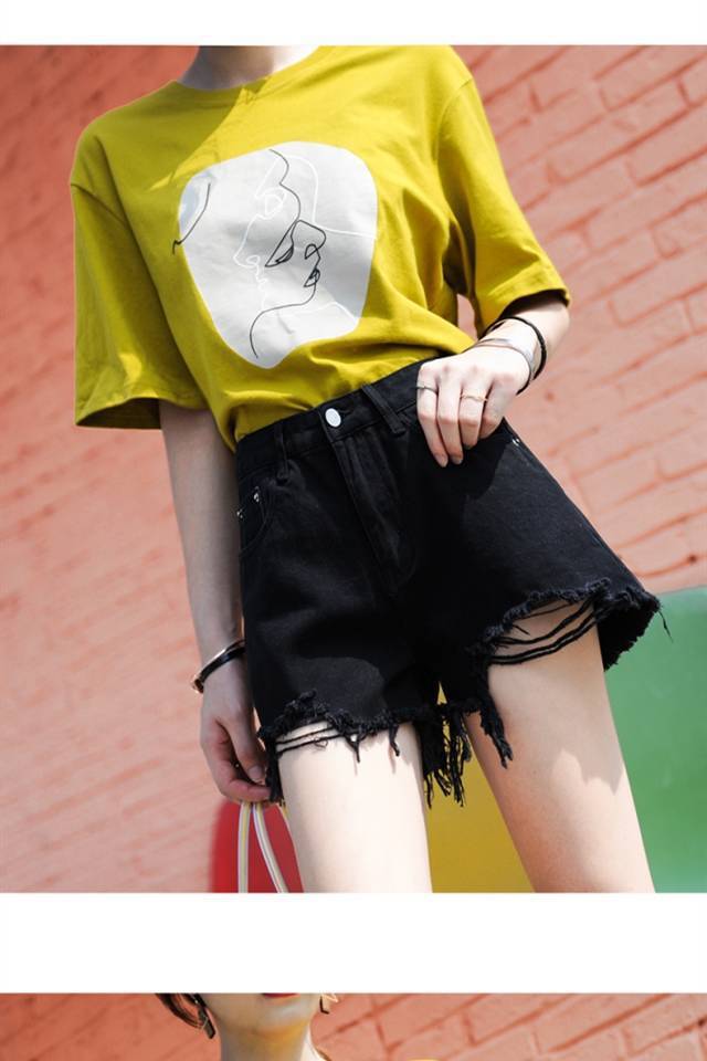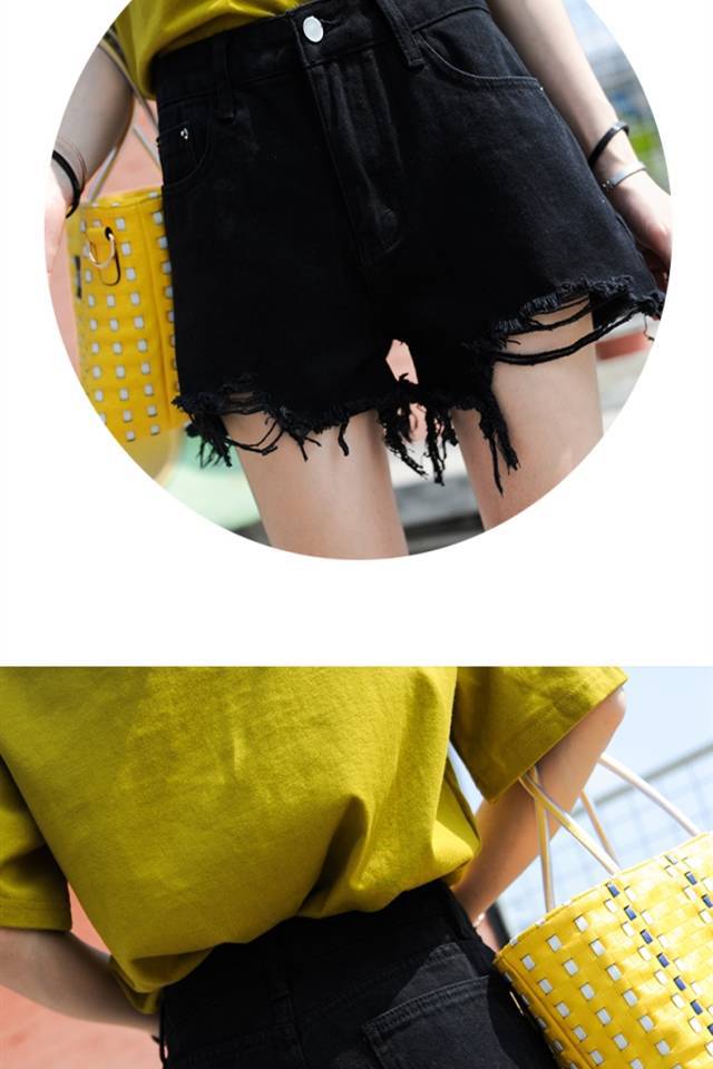 데님 반바지 여성 여름 2020 새로운 한국 스타일 느슨한 찢어진 하이 웨이스트 슬림 핏 모든 매치 블랙 A-라인 퍼 에지 핫 팬츠스토어 가기