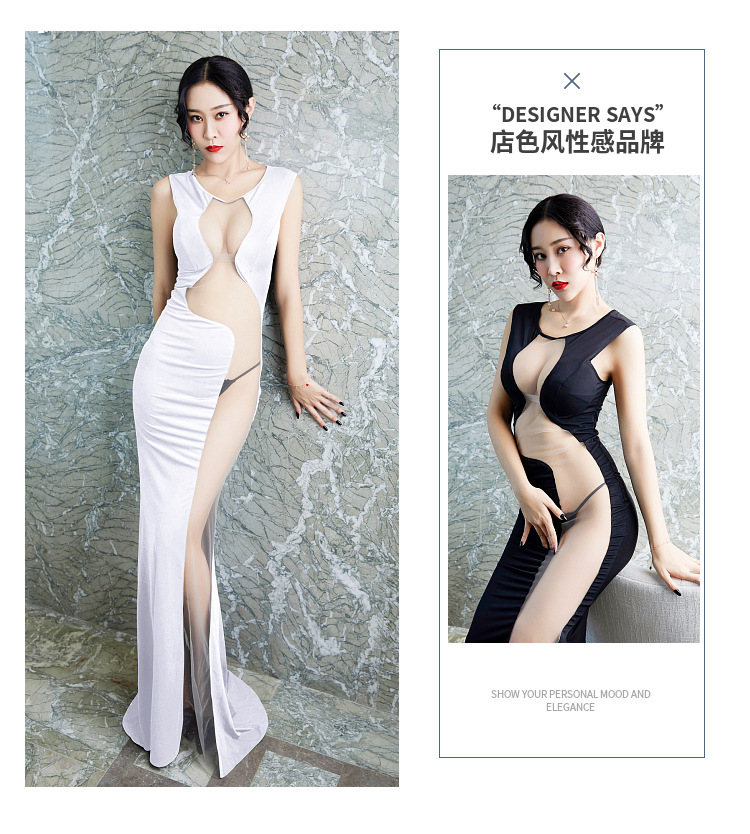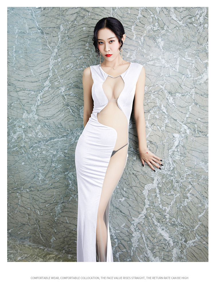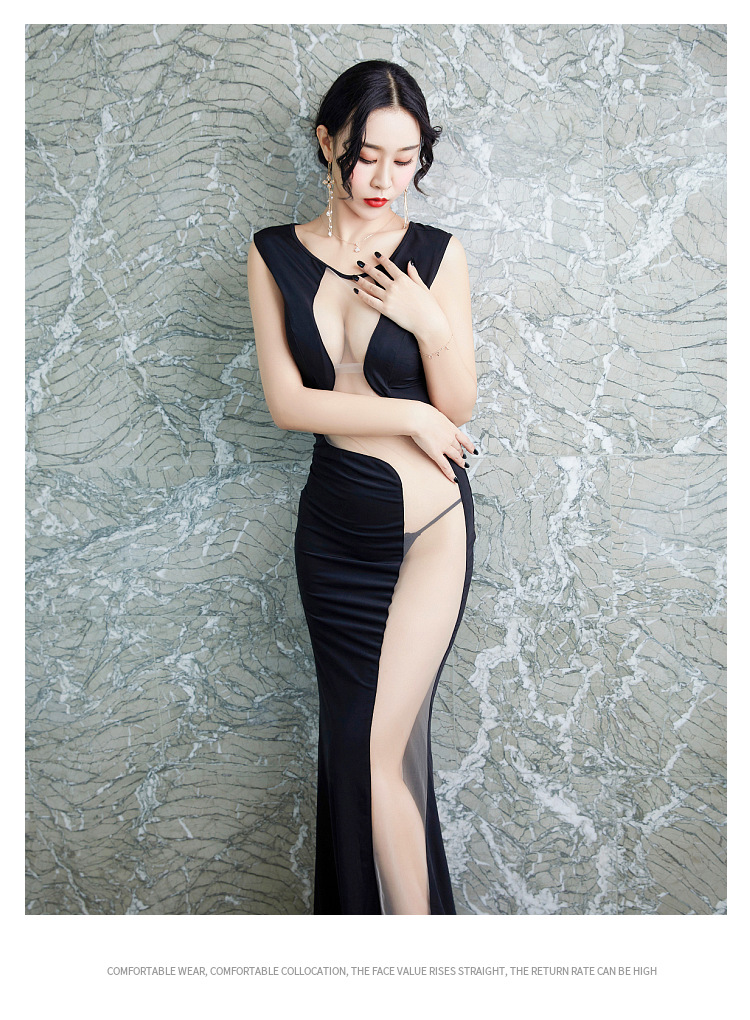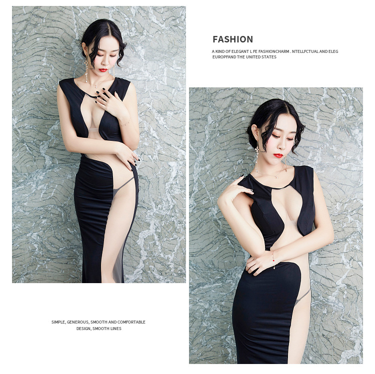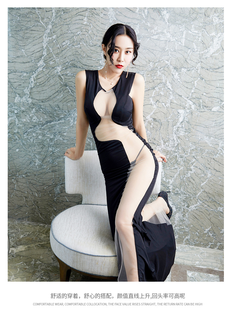 나이트 클럽 섹시한 관점 긴 메쉬 로우 컷 원피스 기질 슬리밍 중공 분할 긴 원피스 바 작은 검은 원피스스토어 가기