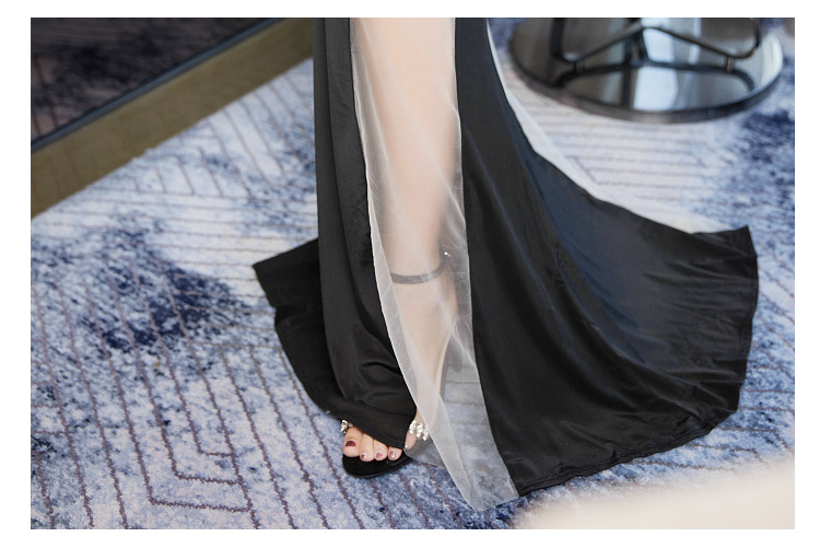 나이트 클럽 섹시한 관점 긴 메쉬 로우 컷 원피스 기질 슬리밍 중공 분할 긴 원피스 바 작은 검은 원피스