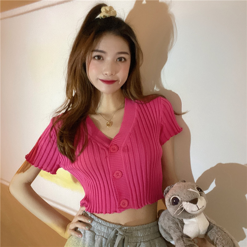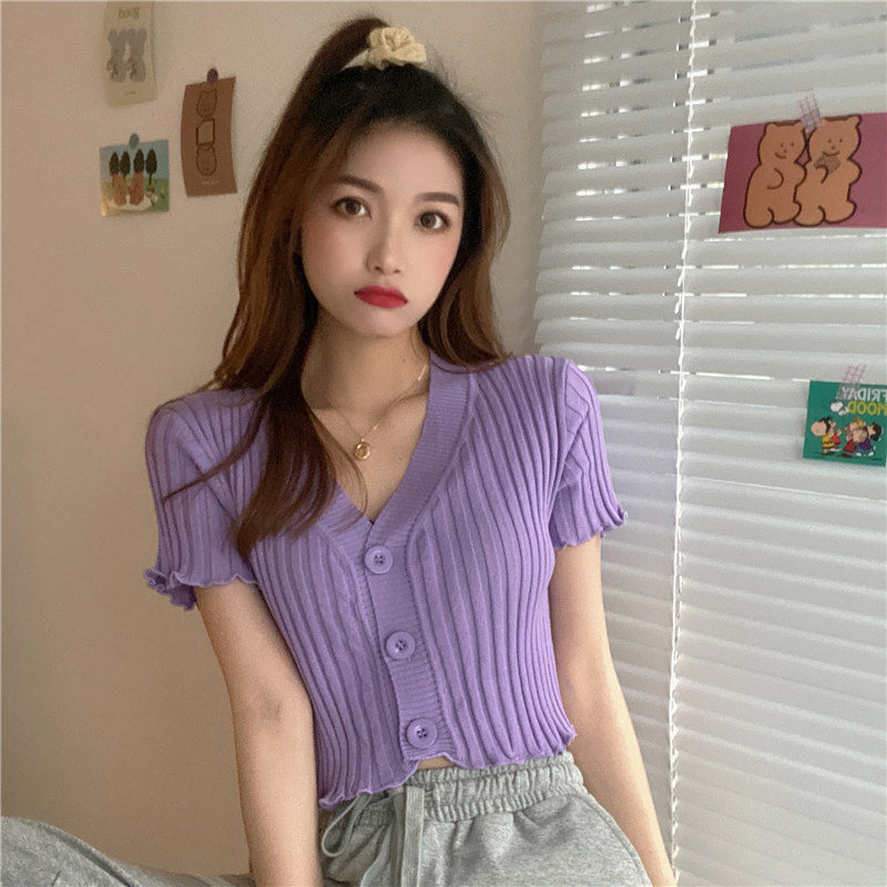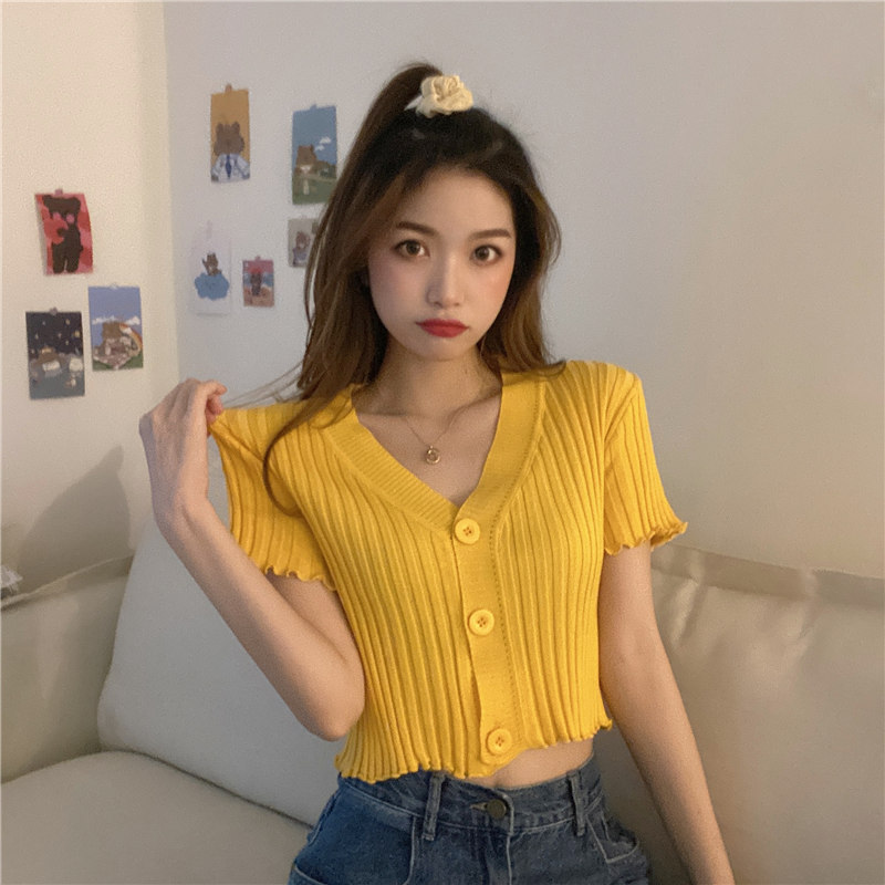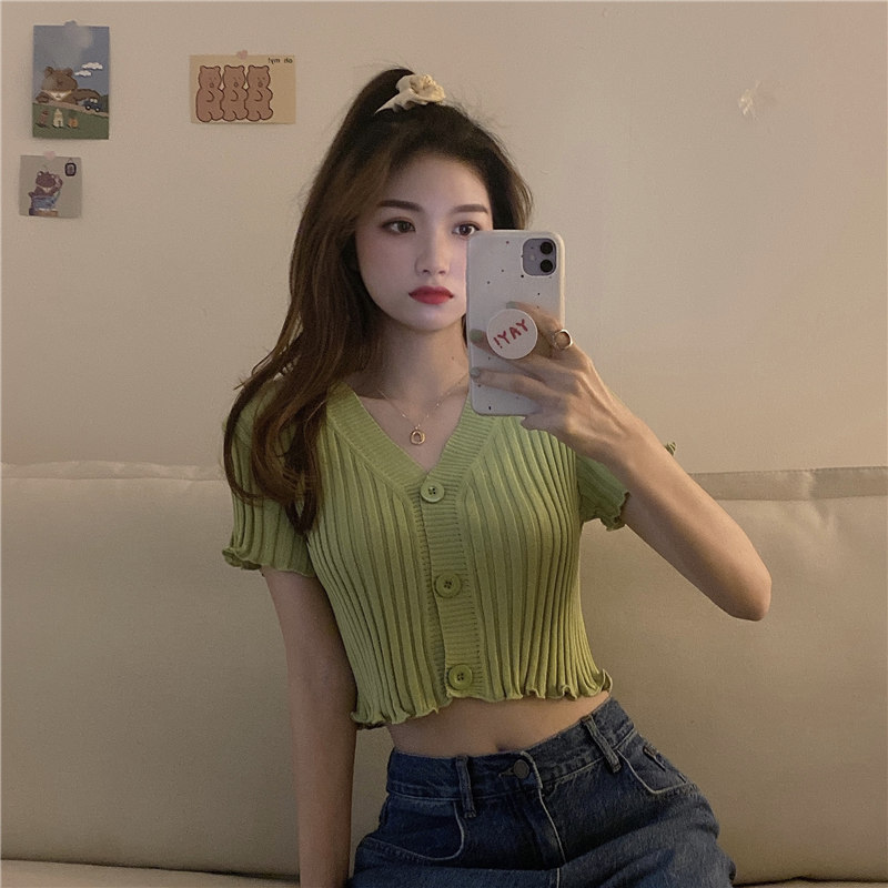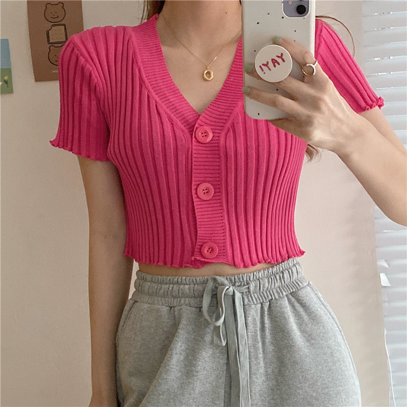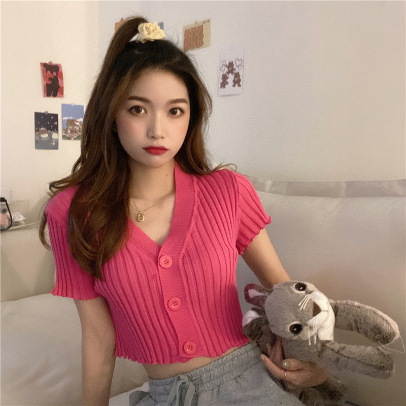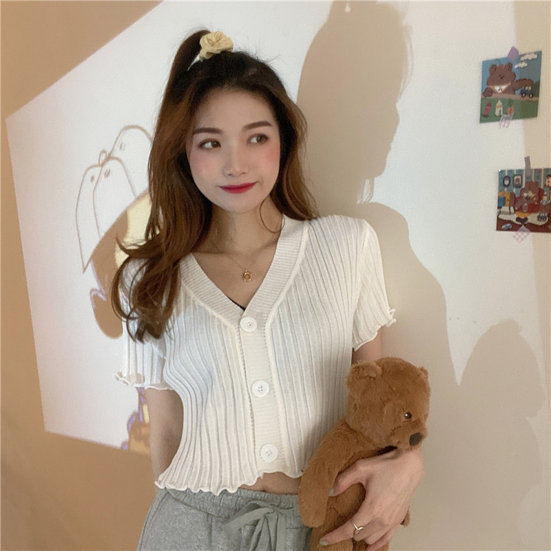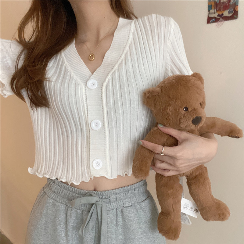 블랙 이어 핏 반팔 니트 가디건 여성용 2023 여름 브이넥 솔리드 컬러 올매치 슬림핏 쇼트 트렌디 탑