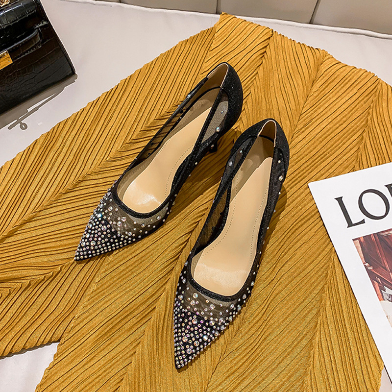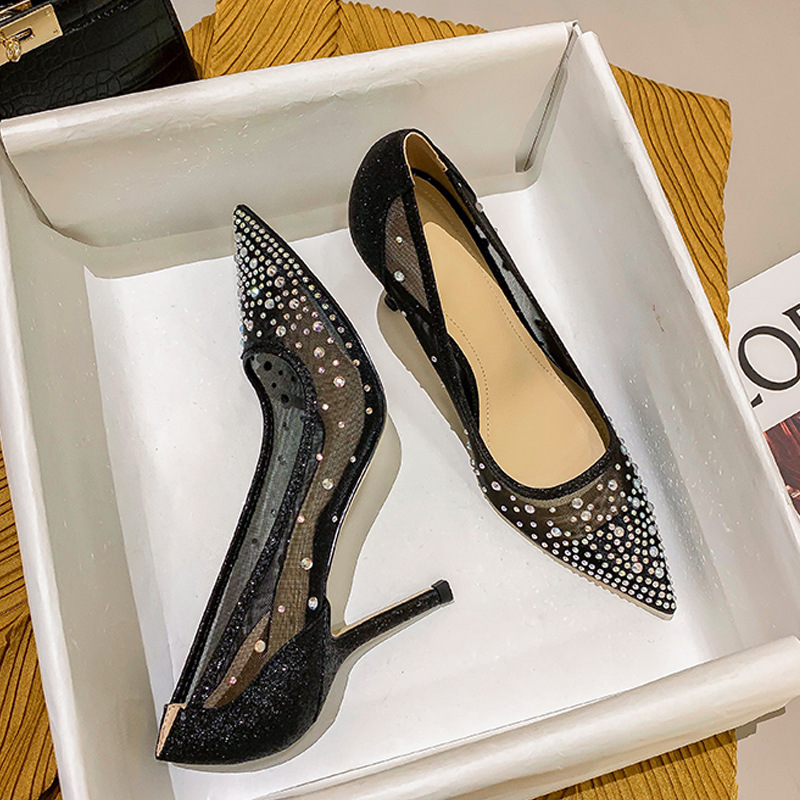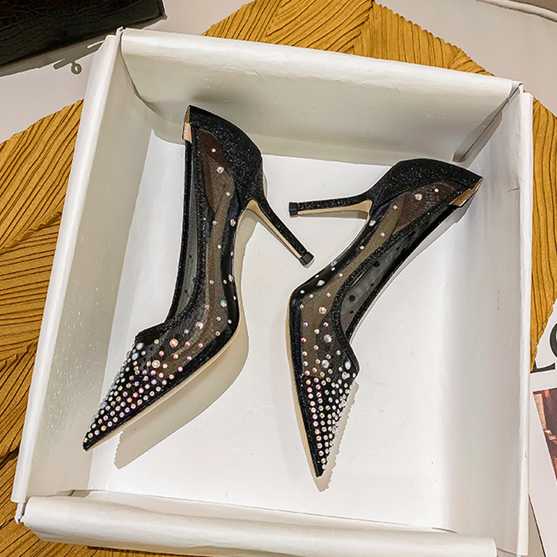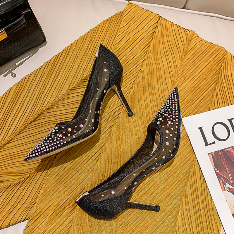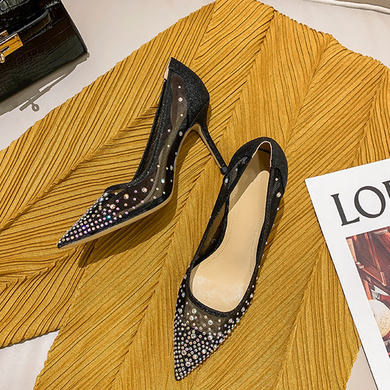 메쉬 라인스톤 신발 여성 2024 년 여름 뉴 컬러 다이아몬드 얕은 입 뾰족한 얇은 굽 슈퍼 하이힐 여성 신발 공장 아울렛스토어 가기
