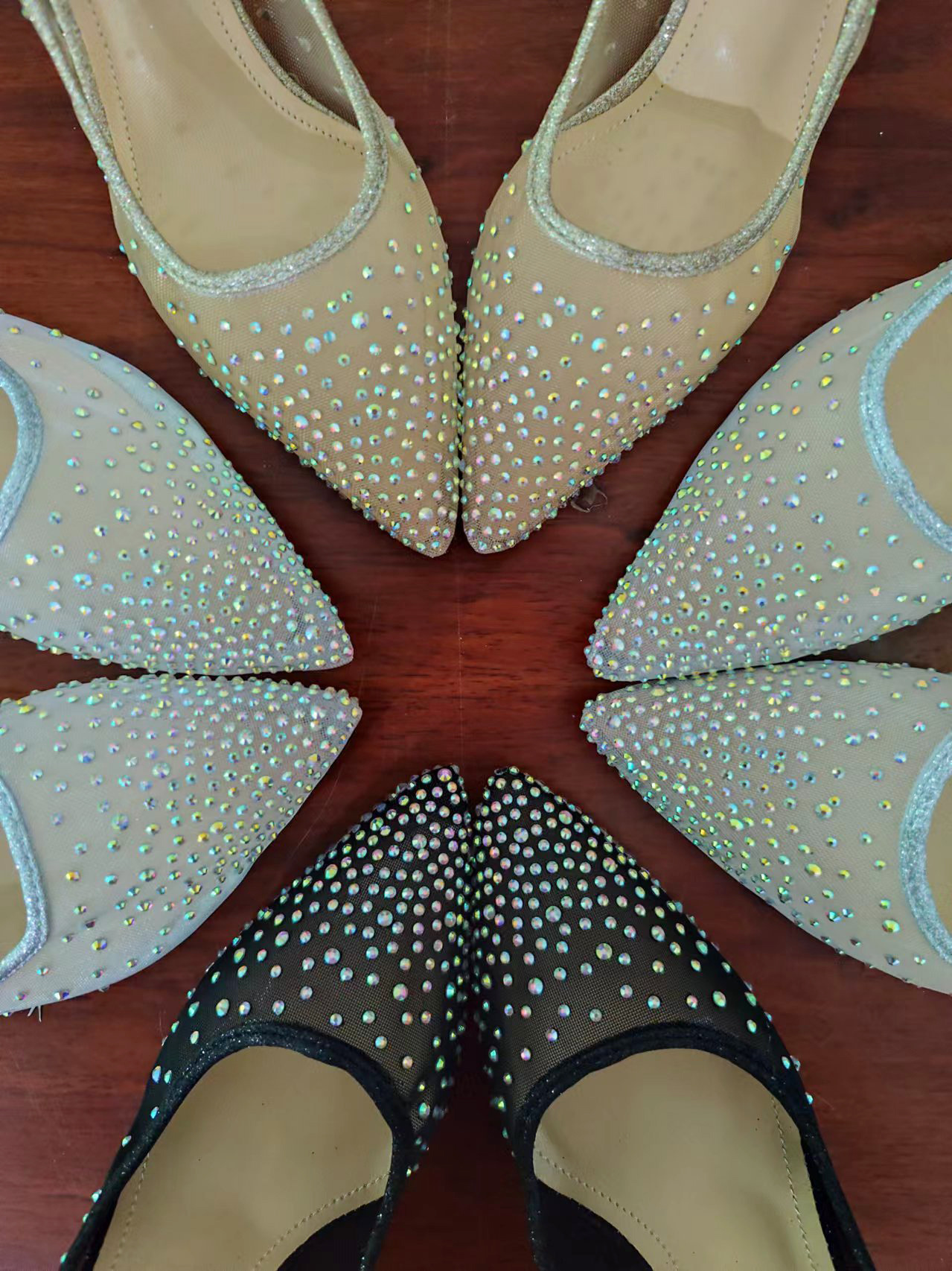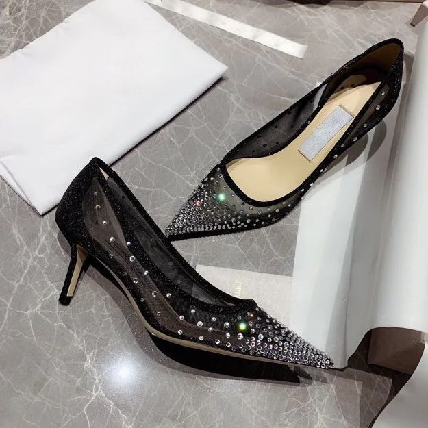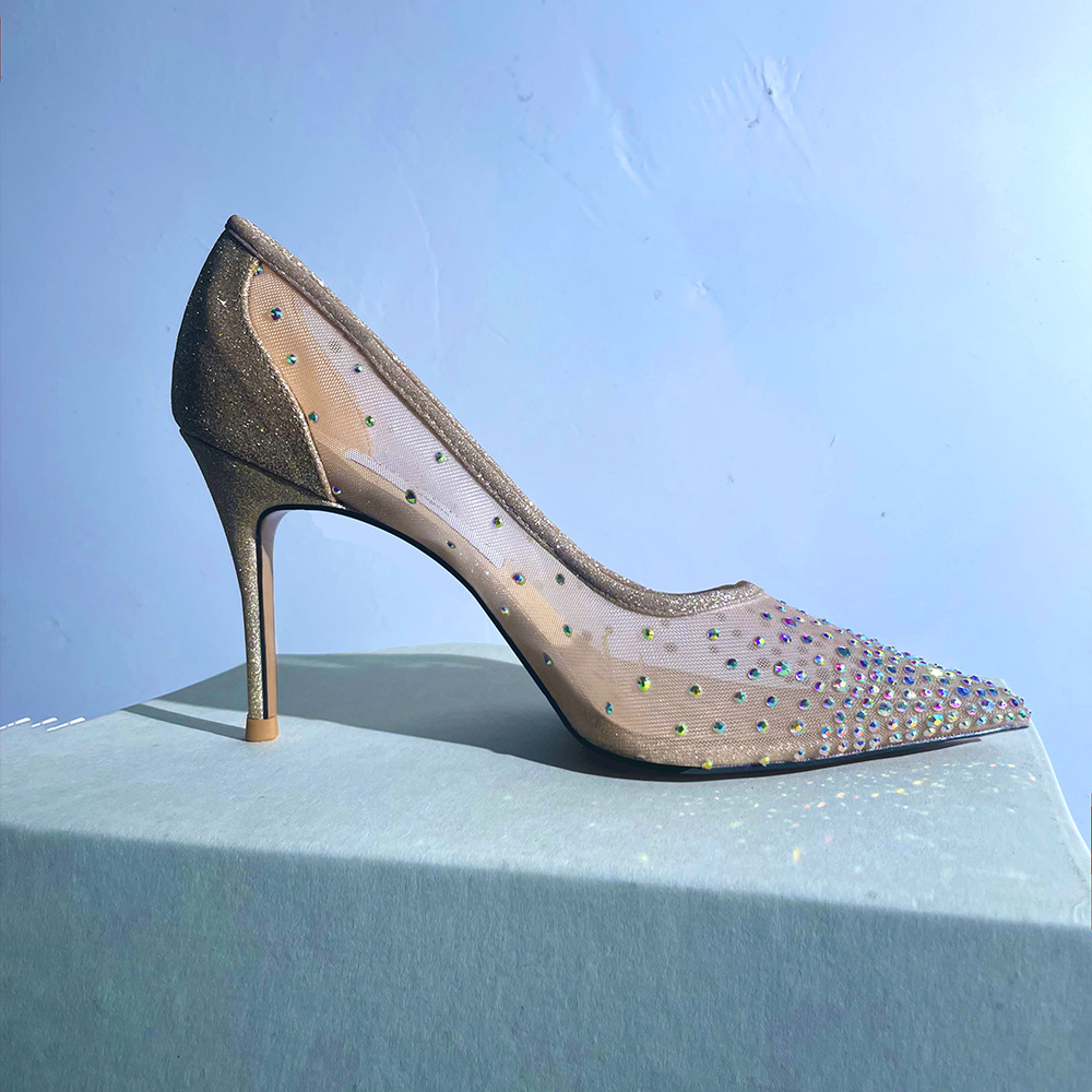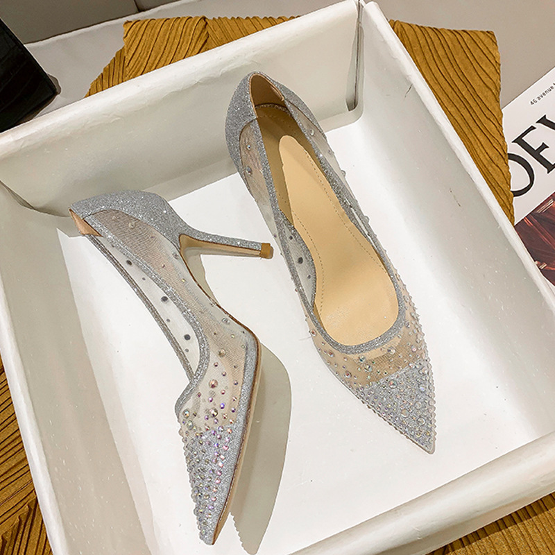 메쉬 라인스톤 신발 여성 2024 년 여름 뉴 컬러 다이아몬드 얕은 입 뾰족한 얇은 굽 슈퍼 하이힐 여성 신발 공장 아울렛스토어 가기